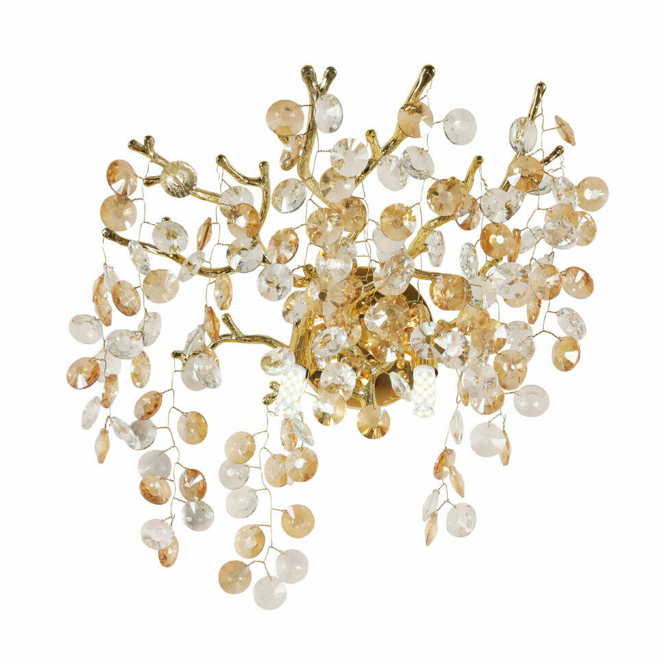 Современный дизайн с природными мотивами. Трендовая флористика, природа в доме. Гармоничное сочетание в декоре прозрачного хрусталя и хрусталя цвета шампань придает светильнику индивидуальность. Заменяемые источники света удобны в эксплуатации. Основание настенного бра выполнено по технологии художественного литья из сплава алюминия с цинком и гальванизировано в цвет золота. Настенное бра декорировано хрусталем прозрачным и гальванизированным в цвет шампань.