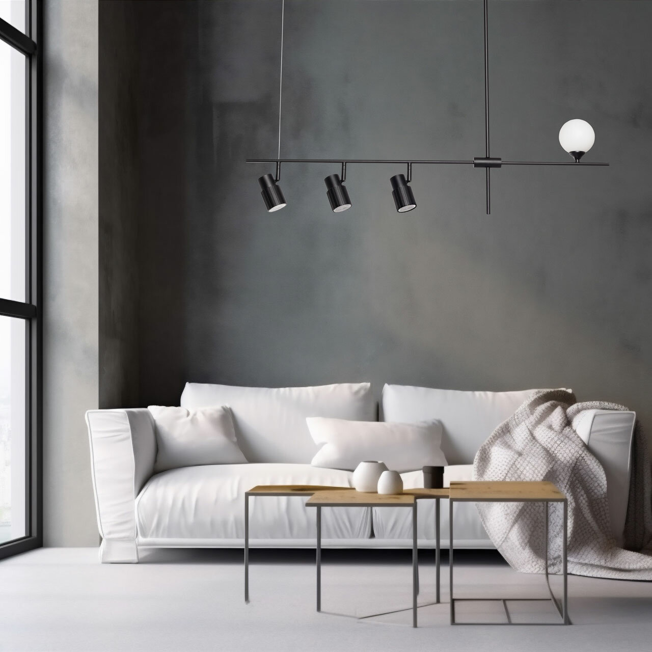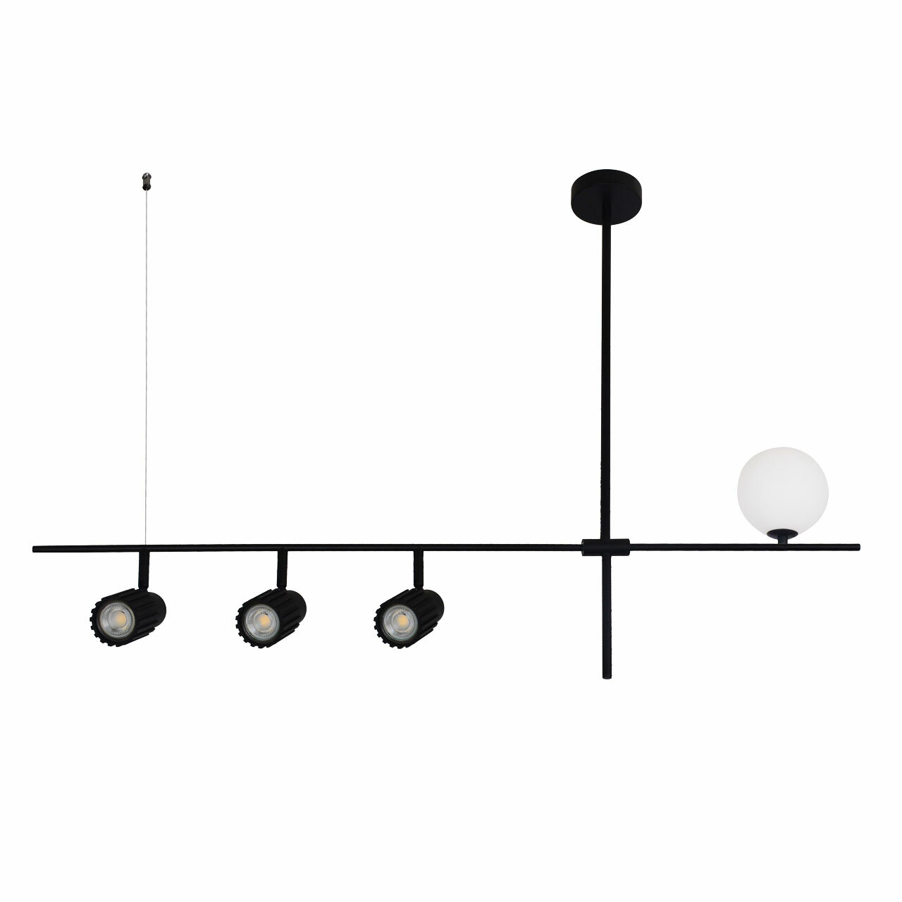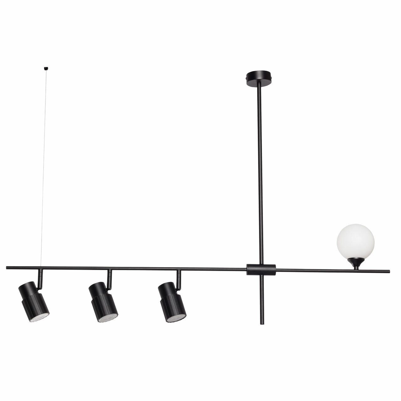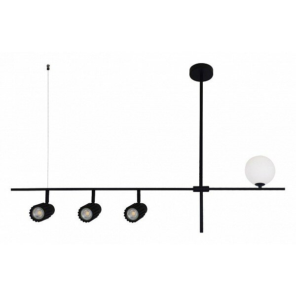 Основание подвеса окрашено в черный цвет, что придает ему современный и стильный вид. Поворотные Споты позволяют направлять световой поток в нужную сторону, что создает комфортное освещение. Белый матовый акрил декоративного плафона мягко рассеивает свет, создавая уютную атмосферу. Вариативность световых решений и фактур подчеркнет стиль и индивидуальность интерьера.