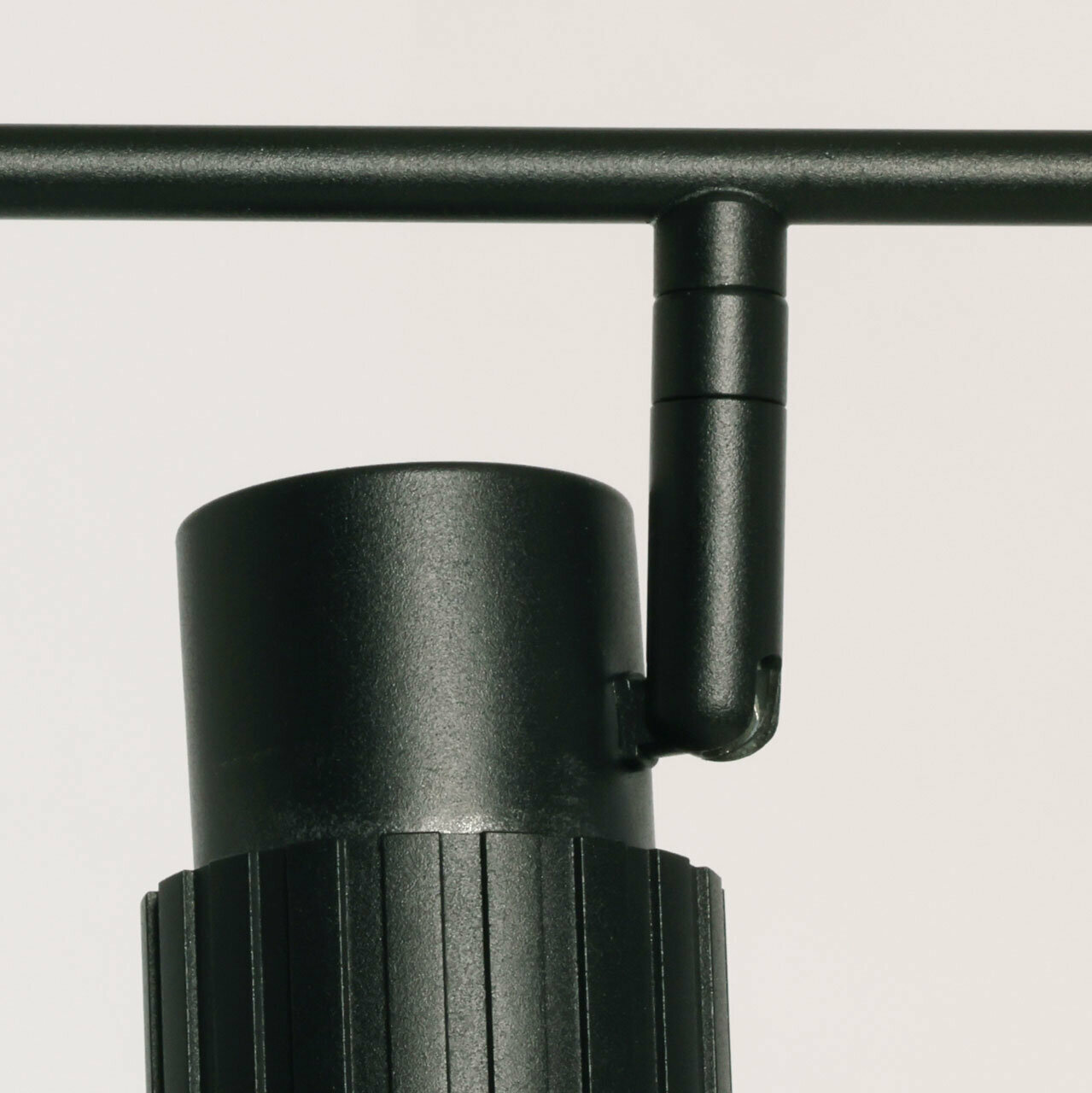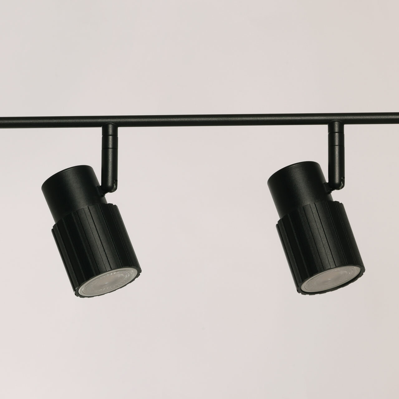 Металлическое основание подвесного светильника окрашено в черный цвет. Корпус плафонов спотов выполнен из сплава алюминия и окрашен в цвет основания. Светодиодный источник света закрыт декоративным плафоном из белого матового акрила.