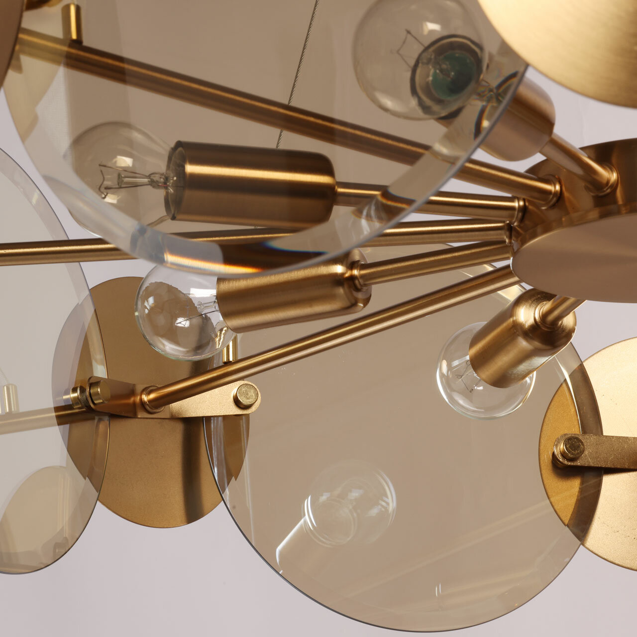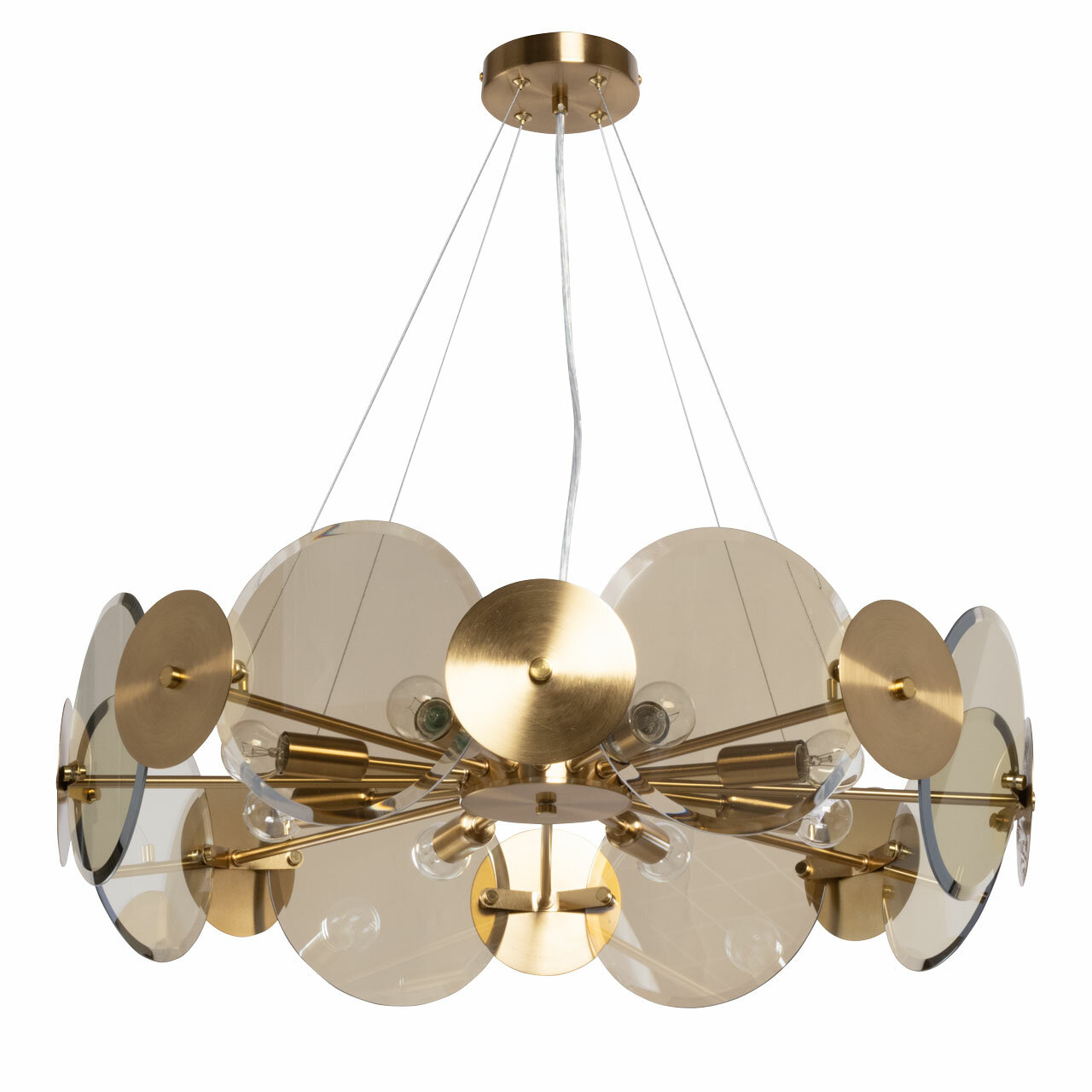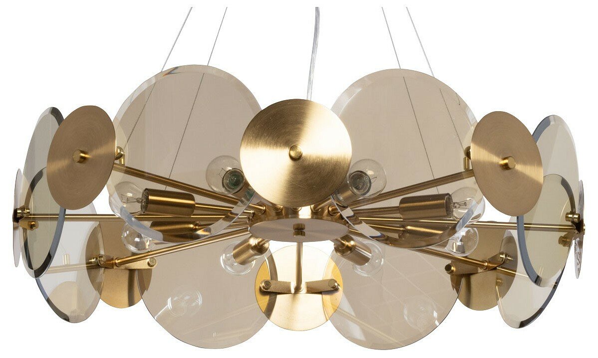 Актуальный цвет латуни смотрится современно. Оригинальный декор из стекла цвета шампань привлекает к себе внимание. Изысканности подвесной люстре придает декор из металлических круглых элементов. Возможность регулировать комфортную высоту. Заменяемые источники света удобны в эксплуатации. Металлическое основание подвесной люстры гальванизировано в цвет латуни. Светильник декорирован стеклянными элементами в форме круга, гальванизированными в цвет шампань и металлическими кругами, гальванизированными в цвет основания.