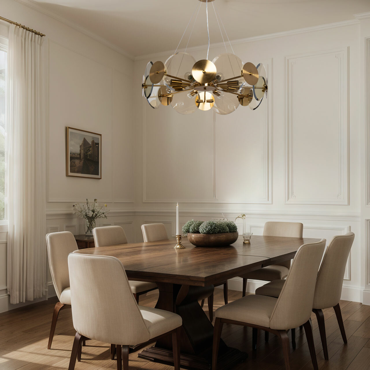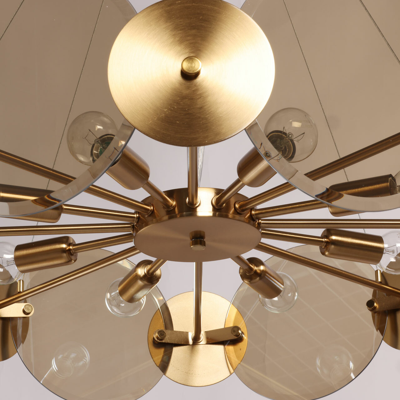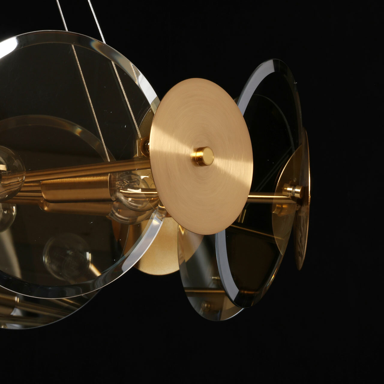 Актуальный цвет латуни смотрится современно. Оригинальный декор из стекла цвета шампань привлекает к себе внимание. Изысканности подвесной люстре придает декор из металлических круглых элементов. Возможность регулировать комфортную высоту. Заменяемые источники света удобны в эксплуатации. Металлическое основание подвесной люстры гальванизировано в цвет латуни. Светильник декорирован стеклянными элементами в форме круга, гальванизированными в цвет шампань и металлическими кругами, гальванизированными в цвет основания.