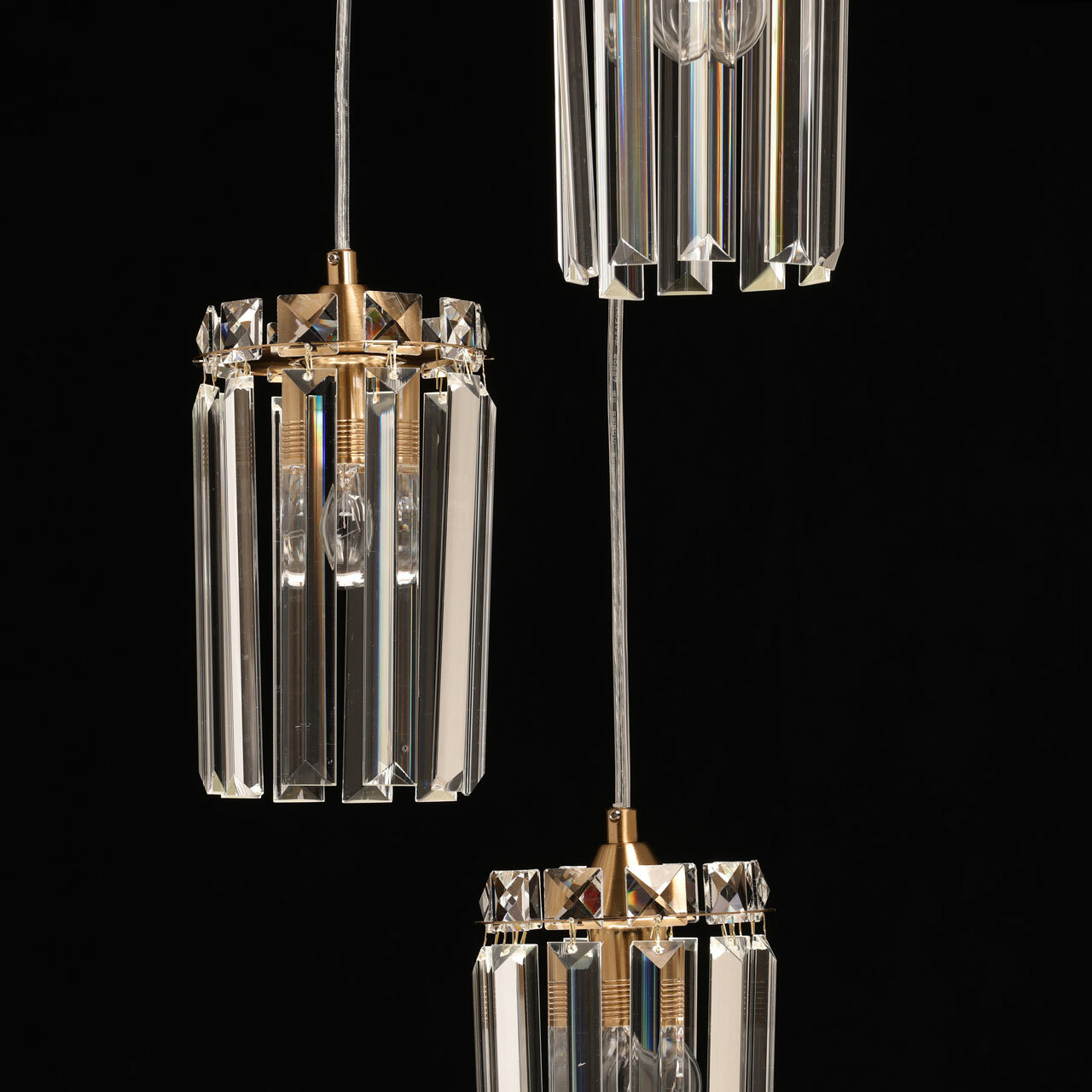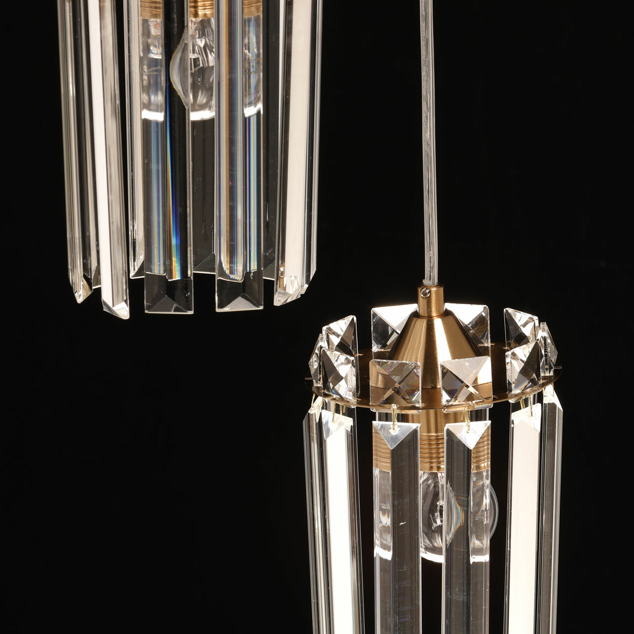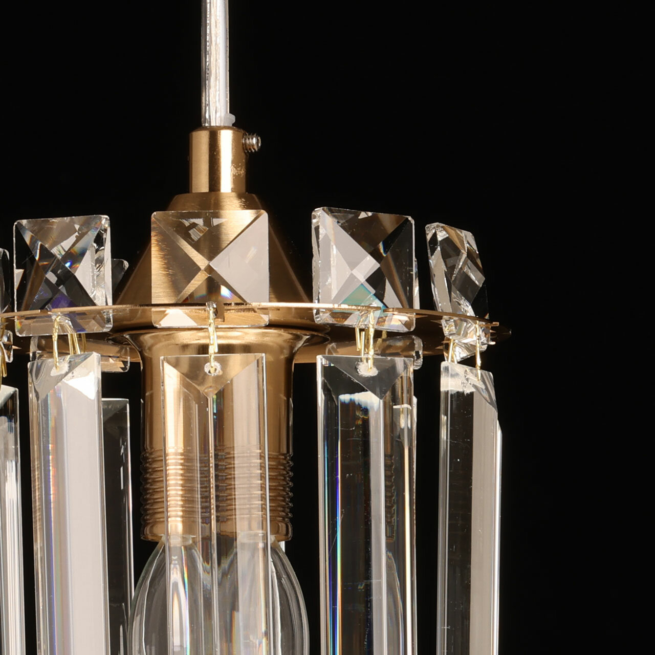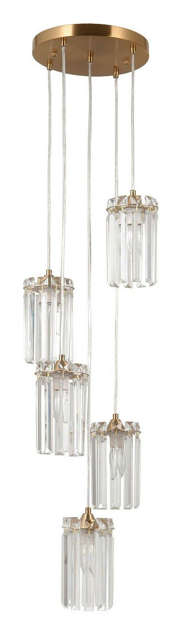 Актуальный цвет латуни придает люстре стильный и современный вид. Вытянутые хрустальные элементы декора добавляют люстре элегантности. Заменяемые источники света удобны в эксплуатации. Возможность регулировать комфортную высоту. Металлическое основание подвесной люстры гальванизировано в цвет латуни. Светильник декорирован подвесками из прозрачного хрусталя вытянутой формы.