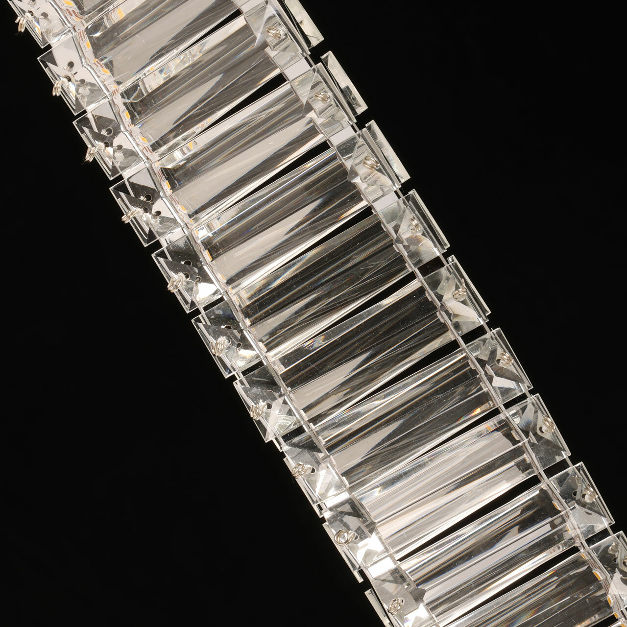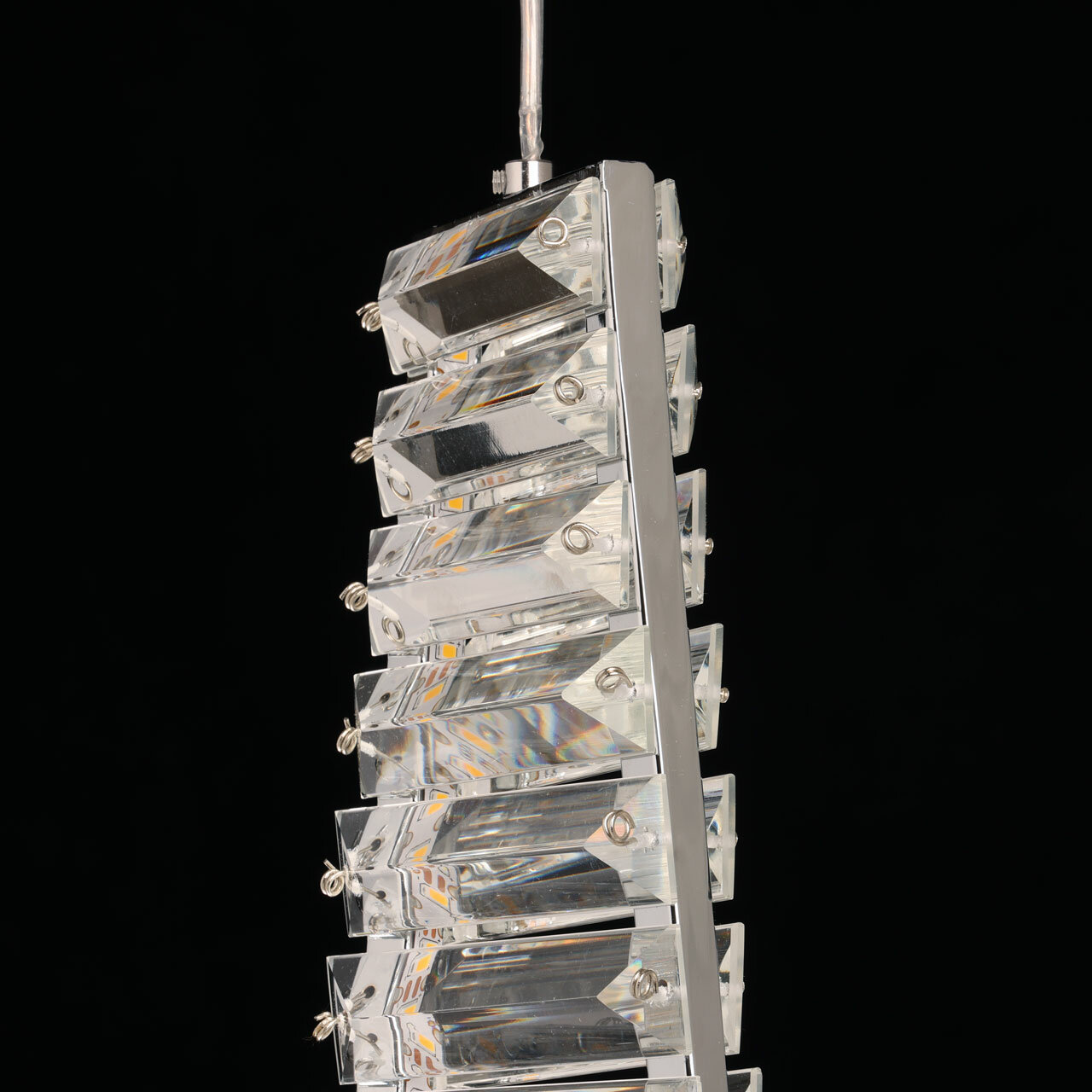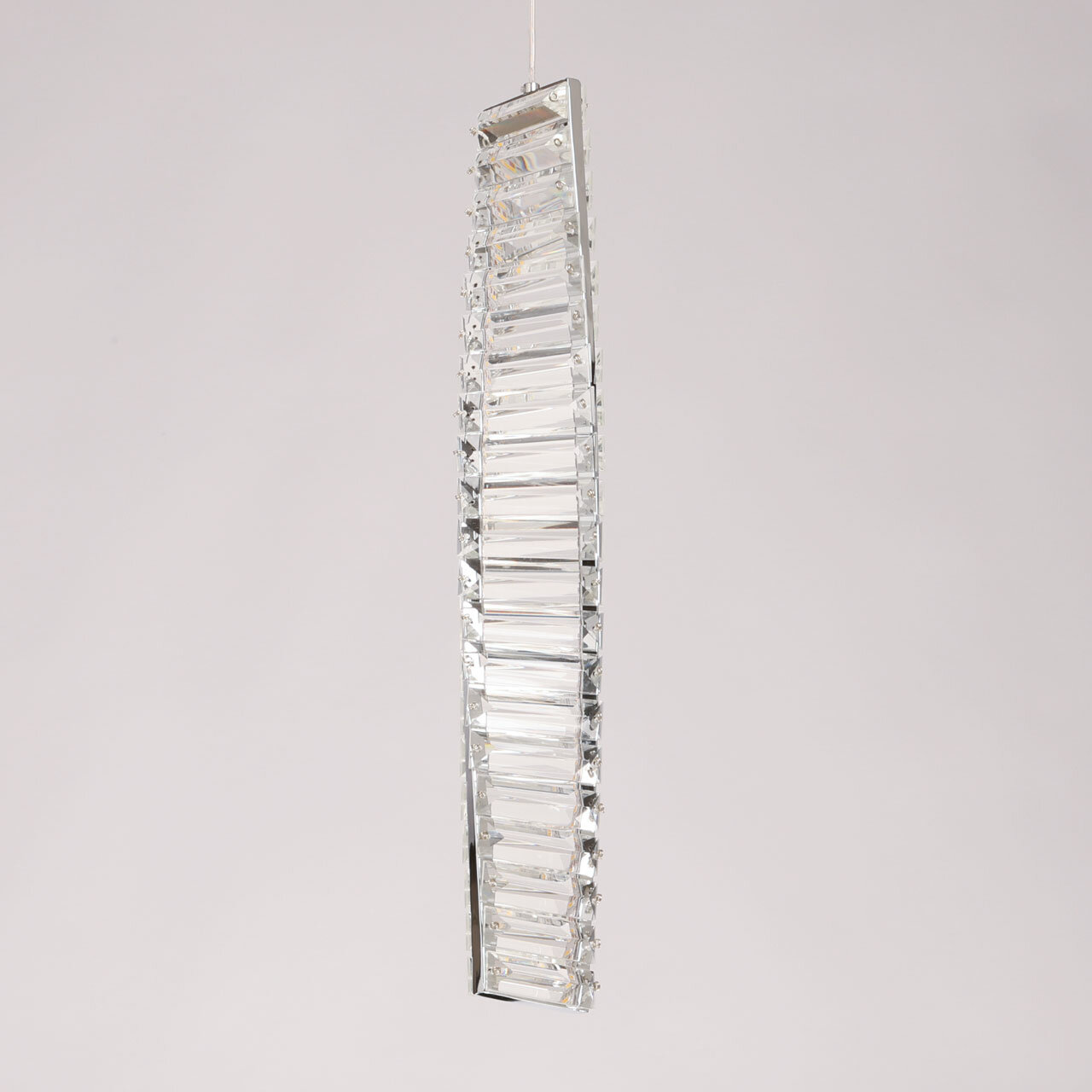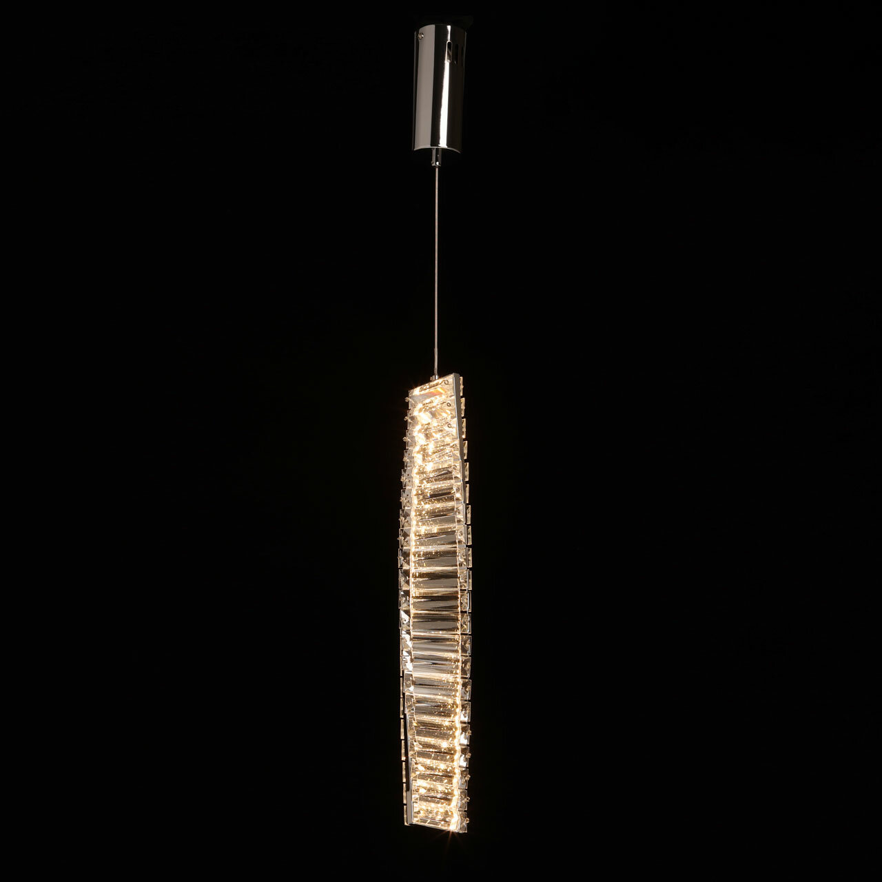 Современный цвет хрома придает подвесу легкости. Оригинальный плафон из хрустальных элементов добавляет элегантности и стиля. Хрусталь создает красивую игру света и отражения, достигая максимального эстетического эффекта. Светодиодные источники света экономичны и безопасны. Возможность регулировать комфортную высоту. Металлическое основание подвесной люстры гальванизировано в цвет хрома. Люстра декорирована прозрачным хрусталем.
