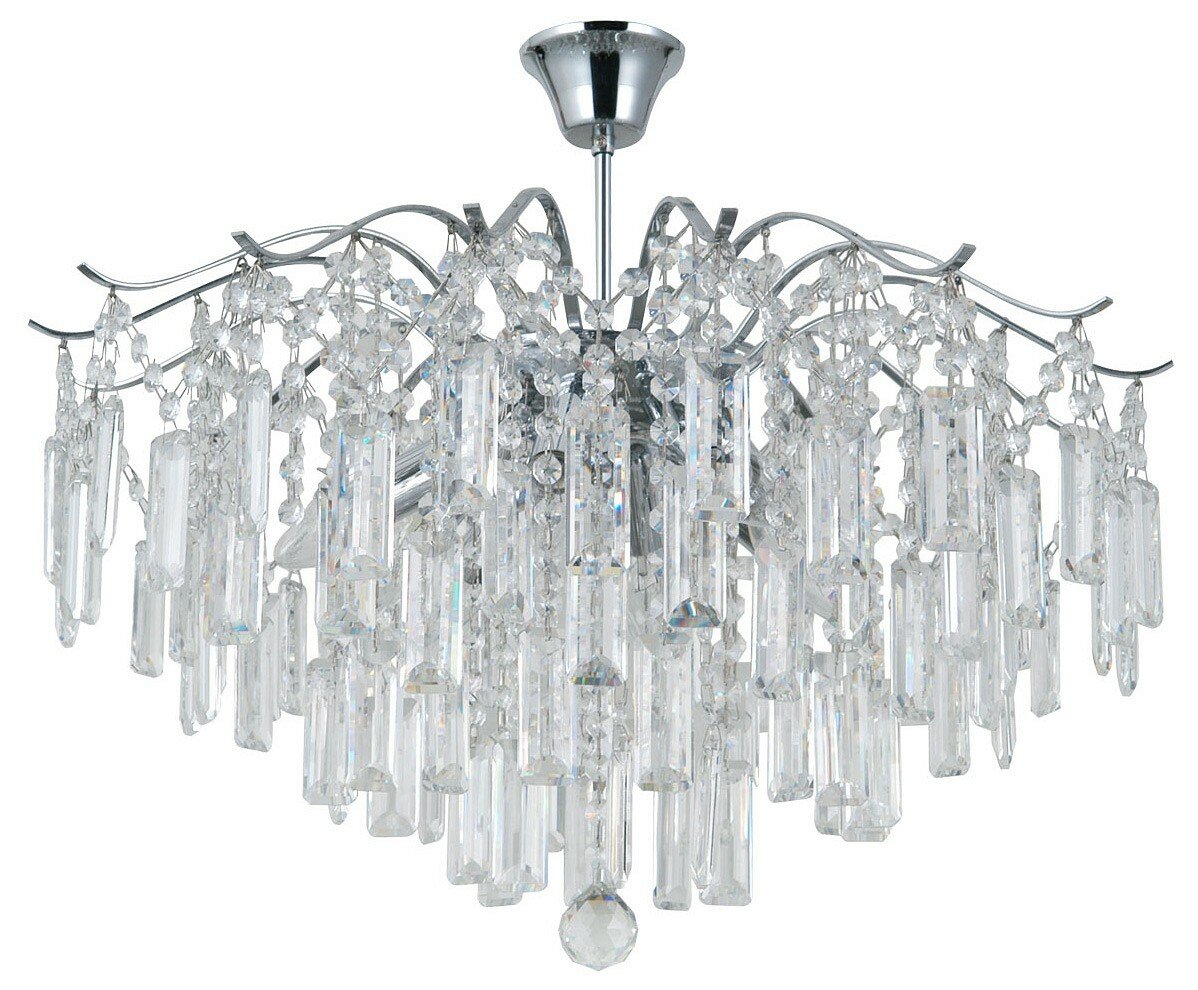 Гальваника в цвет хрома придает люстре современность. Оригинальный декор из хрусталя вытянутой формы тщательно подобран и создает яркое эстетическое впечатление, обеспечивая эффектную игру света. Заменяемые источники света удобны в эксплуатации. Компактная высота актуальна для стандартной высоты потолка.