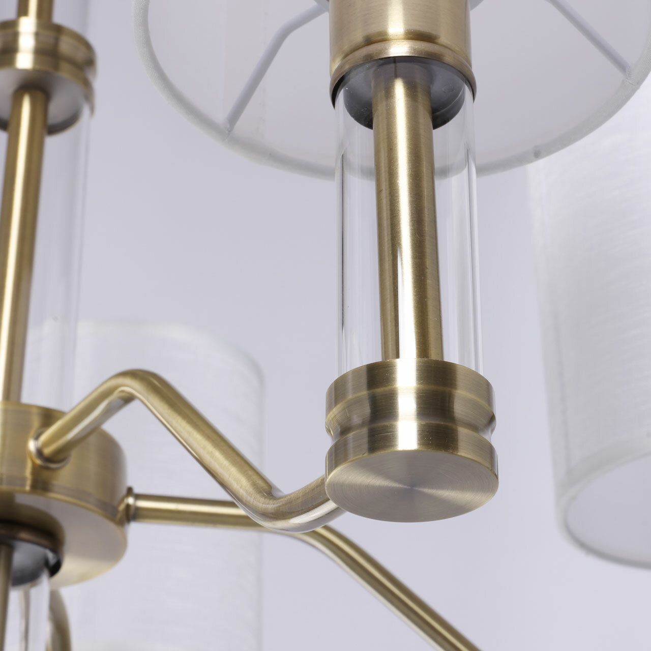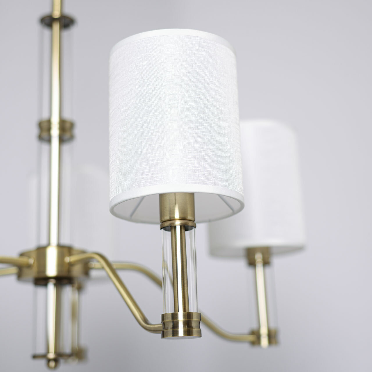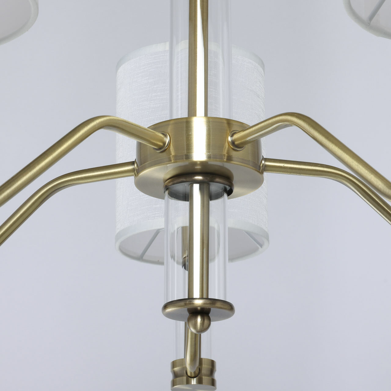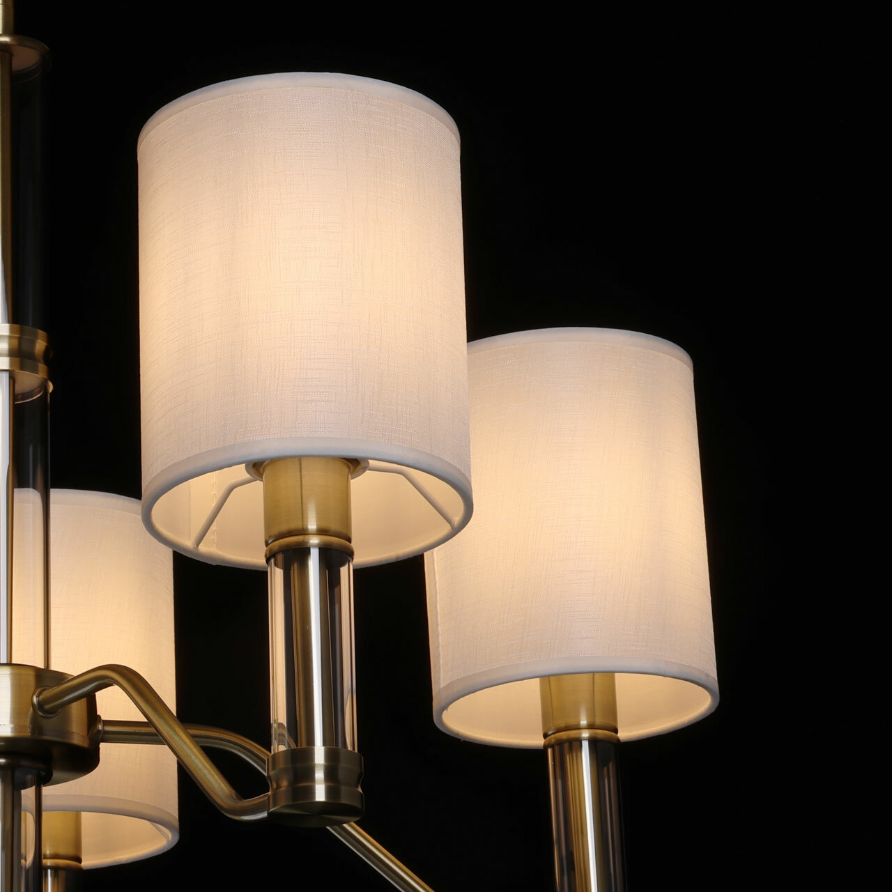 Металлическое основание подвесной люстры гальванизировано в цвет античной бронзы. Традиционные источники света закрыты двухслойными текстильными абажурами белого цвета с термостойким акрилом внутри. Абажуры отделаны кантами и прошиты. Светильник декорирован элементами из прозрачного стекла вытянутой формы.