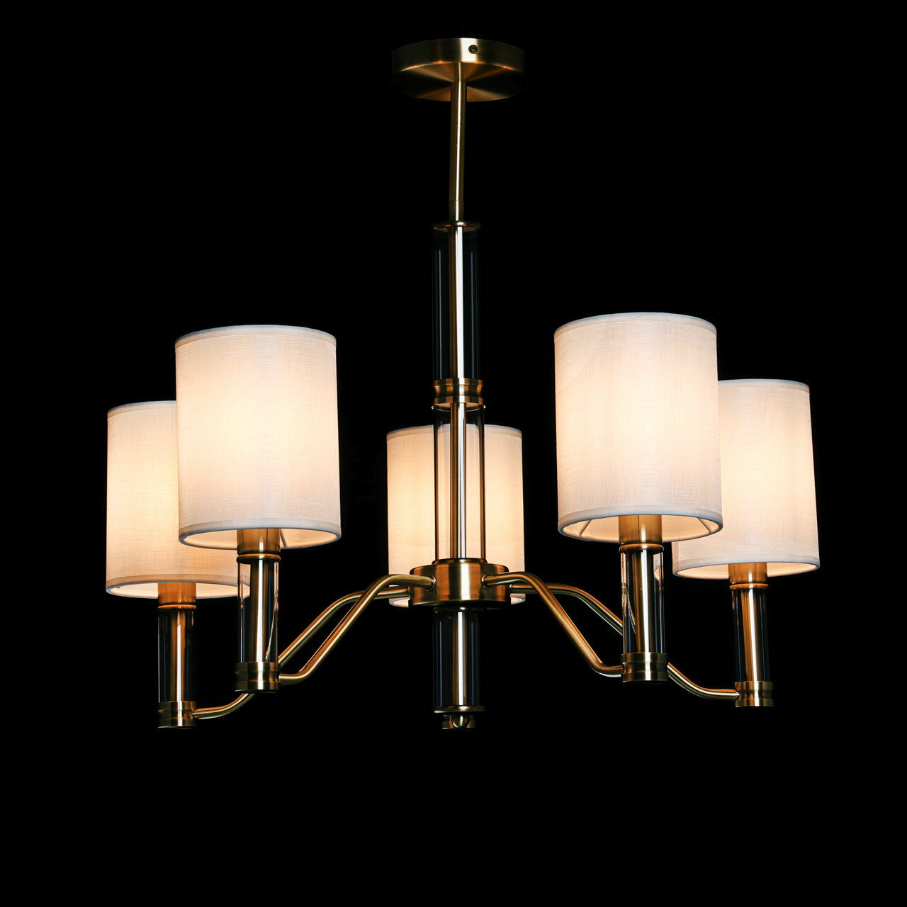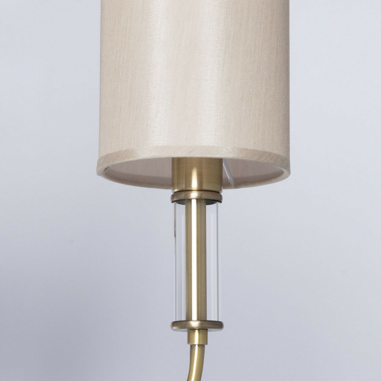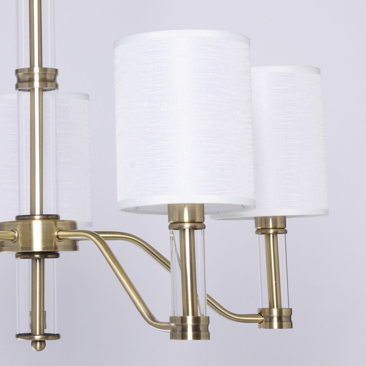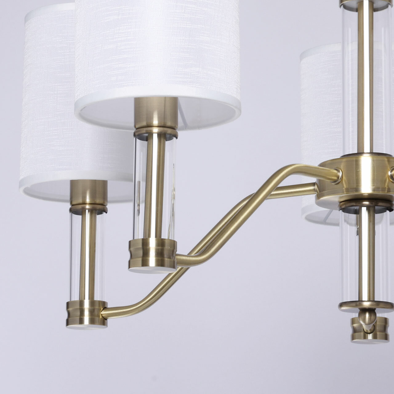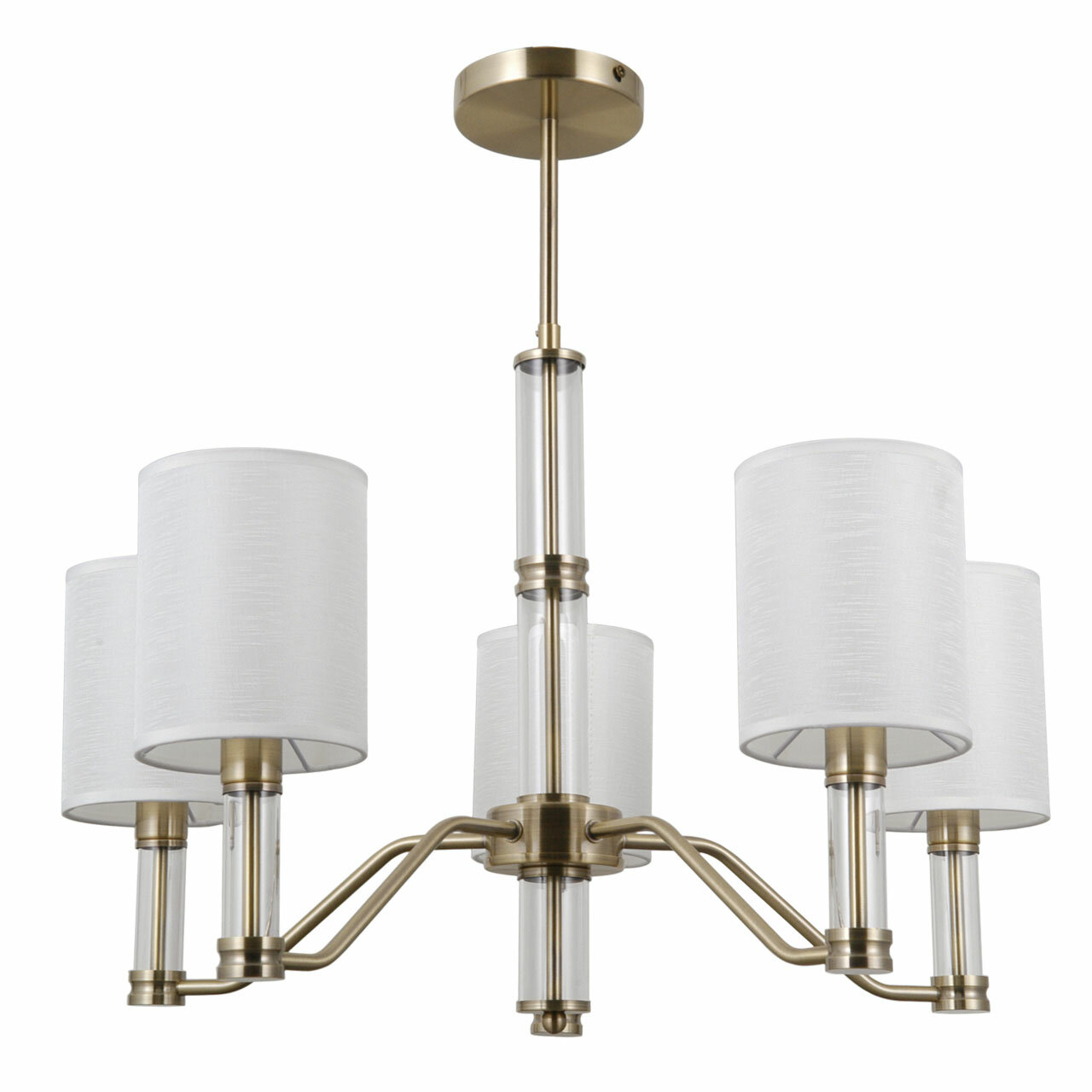 Металлическое основание подвесной люстры гальванизировано в цвет античной бронзы. Традиционные источники света закрыты двухслойными текстильными абажурами белого цвета с термостойким акрилом внутри. Абажуры отделаны кантами и прошиты. Светильник декорирован элементами из прозрачного стекла вытянутой формы.