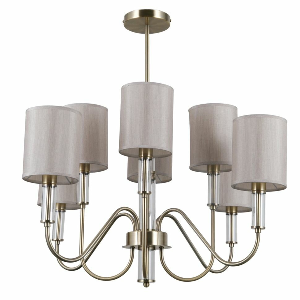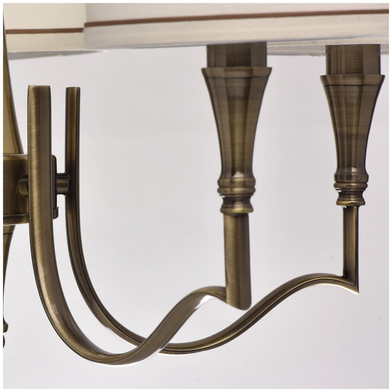 Металлическое основание подвесной люстры гальванизировано в цвет античной бронзы. Традиционные источники света закрыты двухслойными текстильными абажурами белого цвета с термостойким акрилом внутри. Абажуры отделаны кантами и прошиты. Светильник декорирован элементами из прозрачного стекла вытянутой формы.