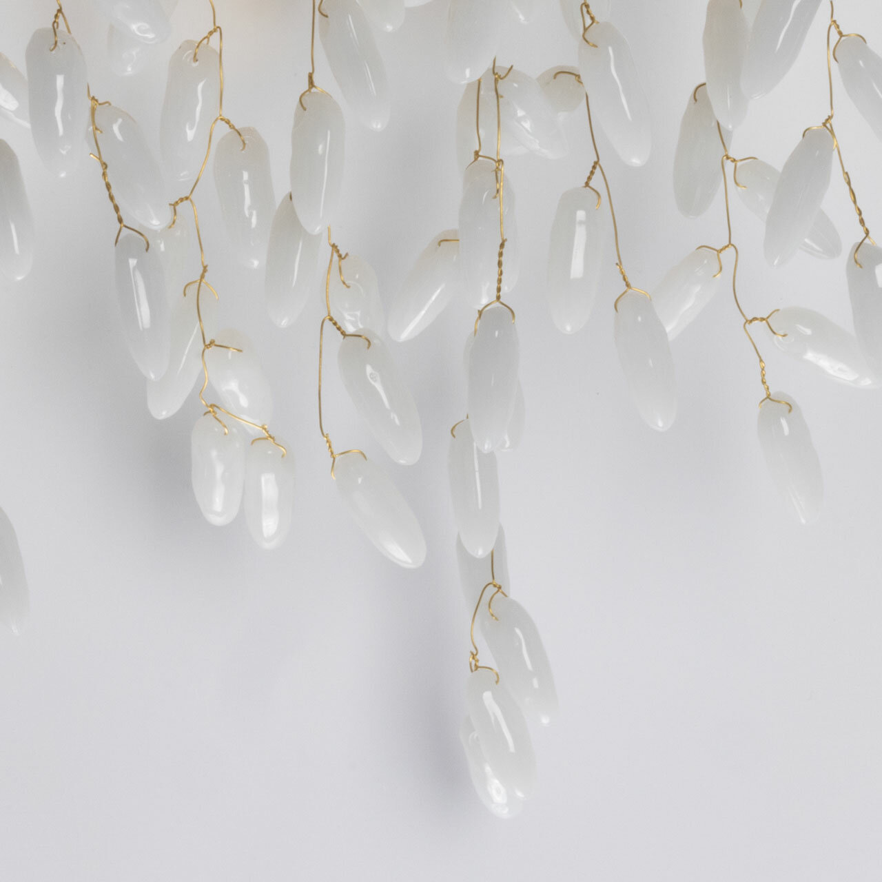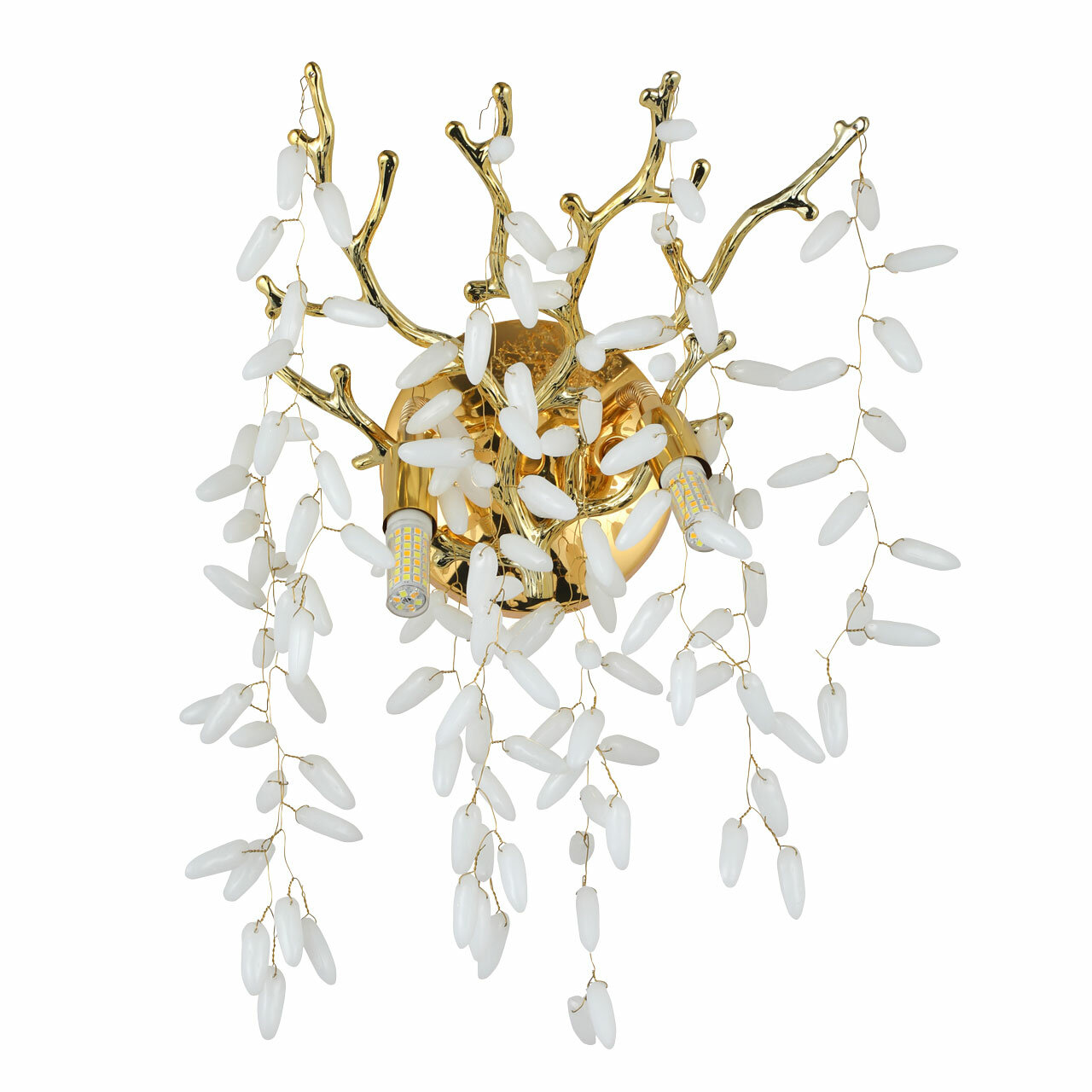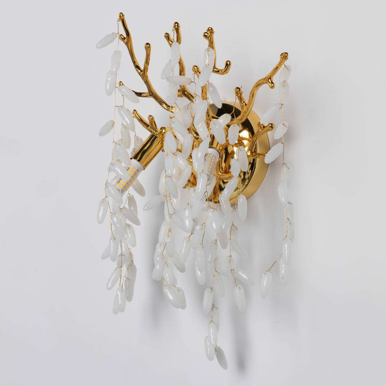 Современный дизайн с природными мотивами. Трендовая флористика, природа в доме. Декор в виде стеклянных гроздьев придает светильнику индивидуальность и создает эффектную игру света и тени. Заменяемые источники света удобны в эксплуатации. Основание настенного бра выполнено по технологии художественного литья из сплава алюминия с цинком и гальванизировано в цвет золота. Настенное бра декорировано гроздьями из белого матового стекла.