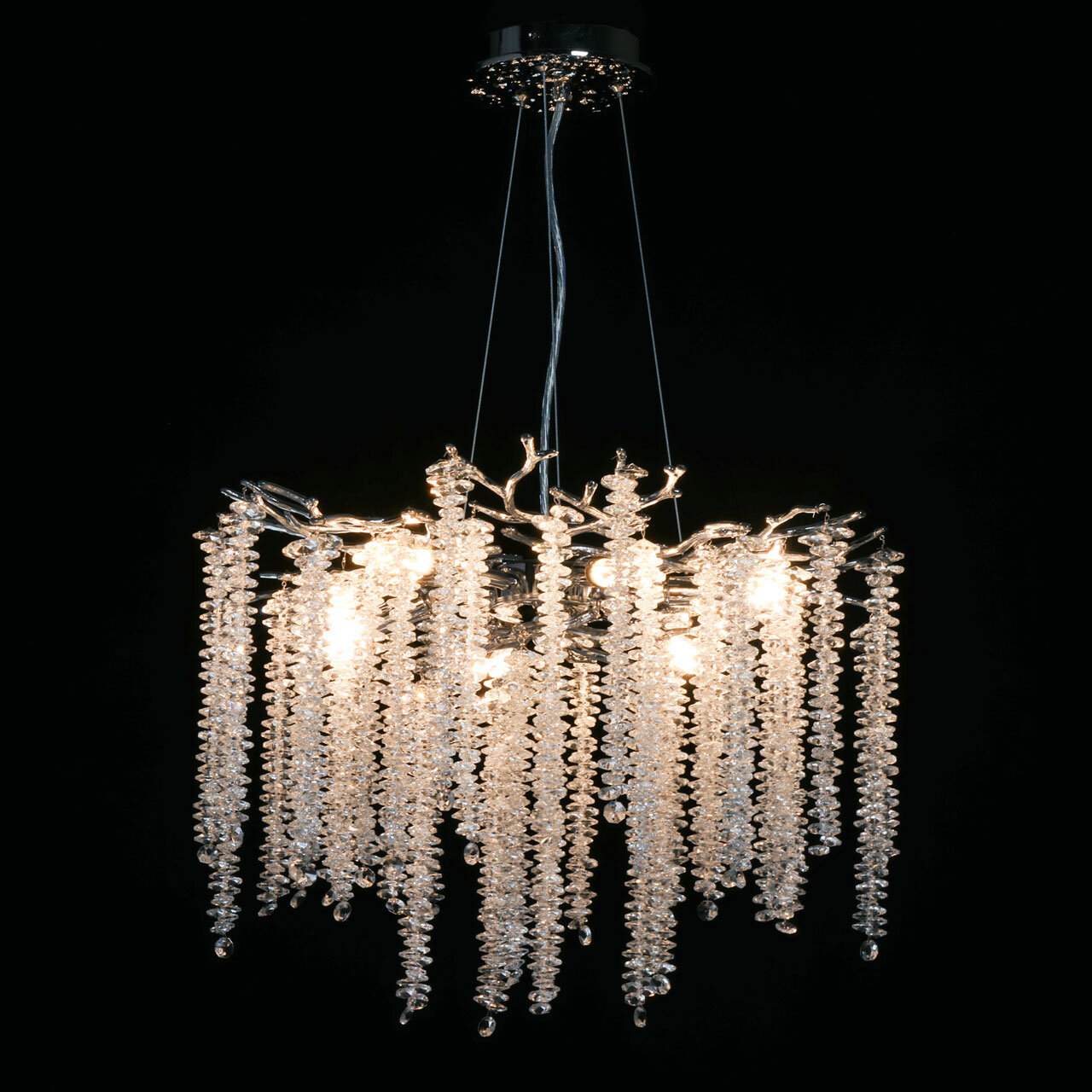 Современный дизайн с природными мотивами. Трендовая флористика, природа в доме. Декор в виде гроздьев из прозрачного хрусталя придает светильнику индивидуальность и создает эффектную игру света. Заменяемые источники света удобны в эксплуатации. Возможность регулировать комфортную высоту. Основание подвесной люстры выполнено по технологии художественного литья из сплава алюминия с цинком и гальванизировано в цвет хрома. Потолочная чаша закрыта фактурным художественным литьем. Люстра декорирована гроздьями из прозрачного хрусталя.