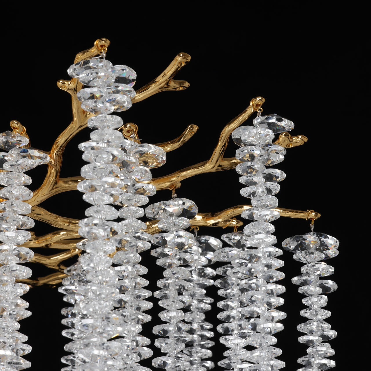 Современный дизайн с природными мотивами. Трендовая флористика, природа в доме. Декор в виде гроздьев из прозрачного хрусталя придает светильнику индивидуальность и создает эффектную игру света. Заменяемые источники света удобны в эксплуатации. Возможность регулировать комфортную высоту. Основание подвесной люстры выполнено по технологии художественного литья из сплава алюминия с цинком и гальванизировано в цвет золота. Люстра декорирована гроздьями из прозрачного хрусталя.
