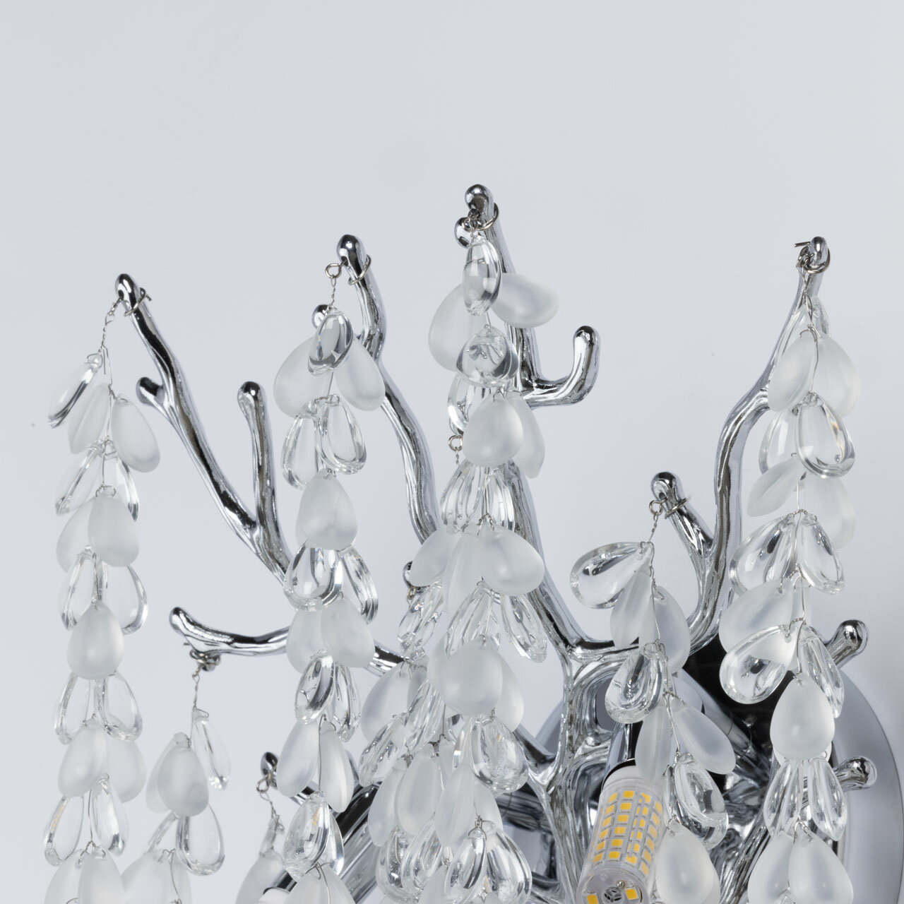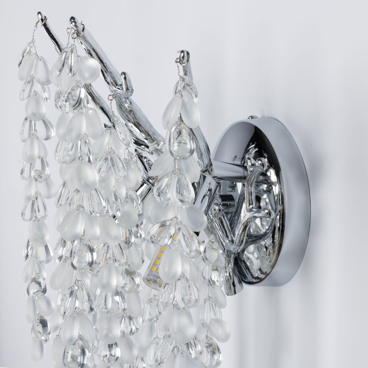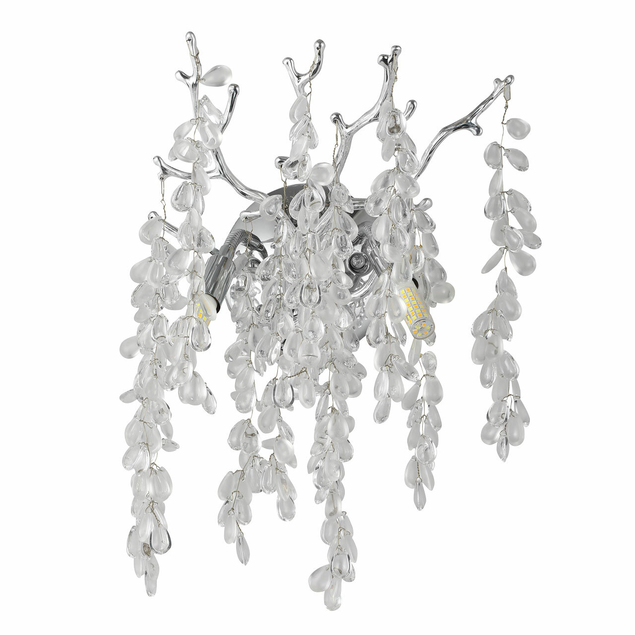 Современный дизайн с природными мотивами. Трендовая флористика, природа в доме. Декор в виде стеклянных гроздьев придает светильнику индивидуальность и создает эффектную игру света и тени. Заменяемые источники света удобны в эксплуатации. Основание настенного бра выполнено по технологии художественного литья из сплава алюминия с цинком и гальванизировано в цвет хрома. Настенное бра декорировано гроздьями из матового и прозрачного стекла.