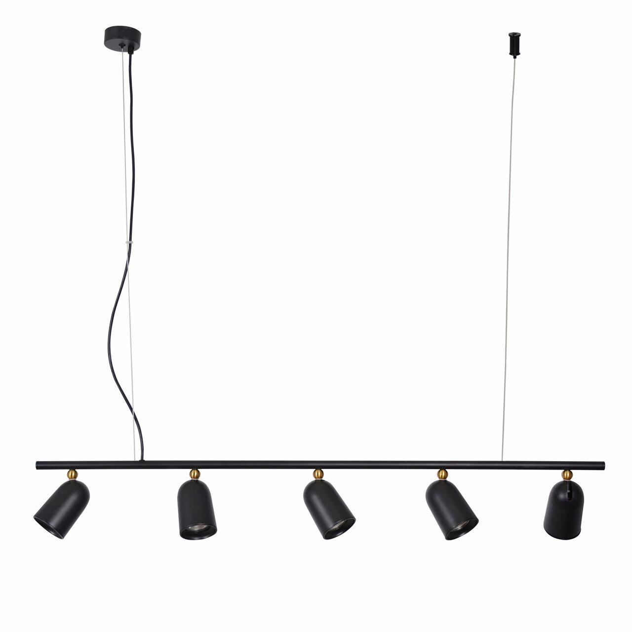 Глубокий черный цвет придает люстре современный вид. Для дополнительного декоративного эффекта, плафоны декорированы металлической сферой. Поворотные плафоны позволяют направлять световой поток в нужную сторону, что создает комфортное освещение. Вариативность световых решений и фактур подчеркнет стиль и индивидуальность интерьера. Возможность регулировать комфортную высоту. Заменяемые источники света удобны в эксплуатации.