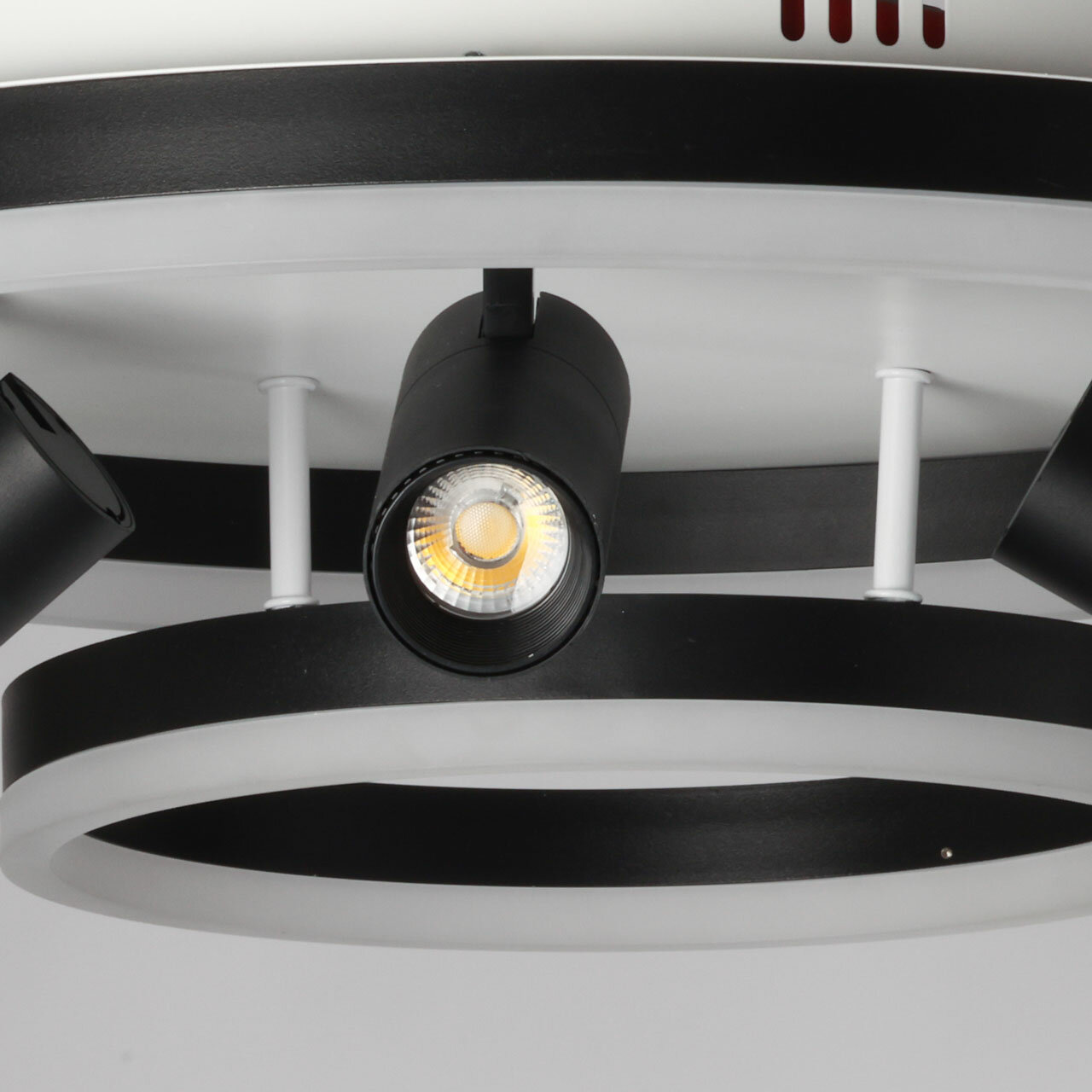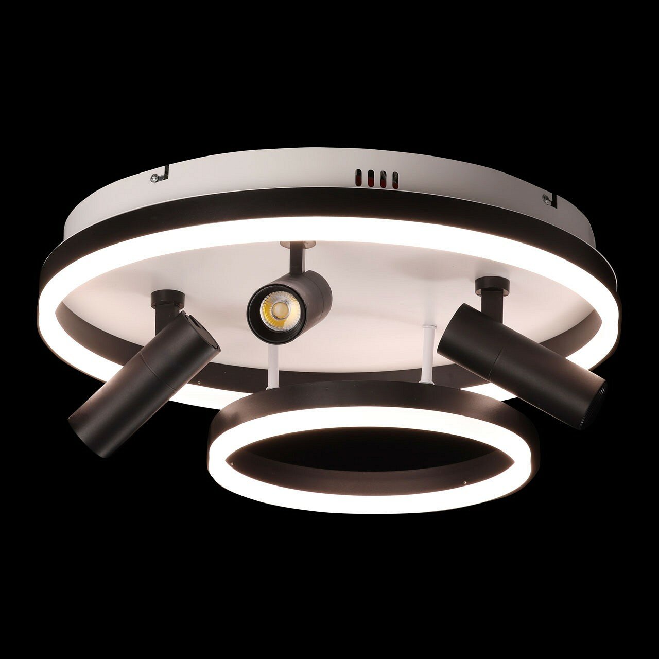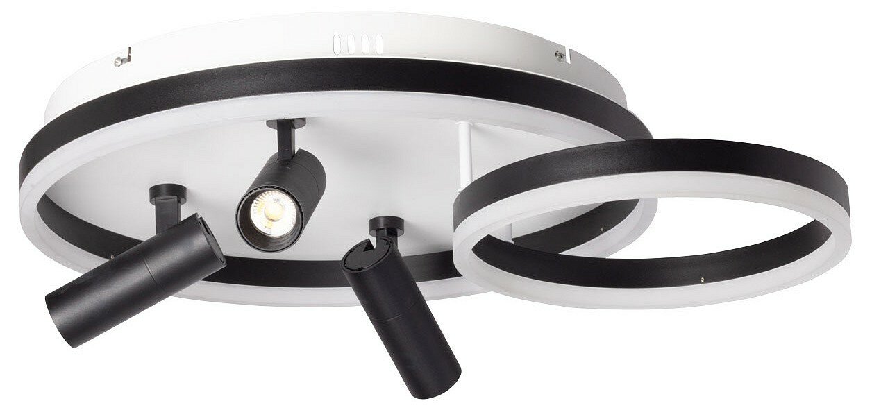 Глубокий черный цвет плафонов в сочетании с белым цветом основания добавляет светильнику концептуальности. Матовый акрил мягко рассеивает свет, создавая комфортное освещение. Многорежимность освещения от 3000К до 6500К позволяет подобрать комфортную температуру света. Качественные светодиоды экономичны и безопасны. Поворотные споты позволяют направлять световой поток в нужную сторону, что создает акцентное освещение. Компактный размер потолочной люстры подойдет к интерьерам со стандартным потолком. Наличие ПДУ удобно в эксплуатации.