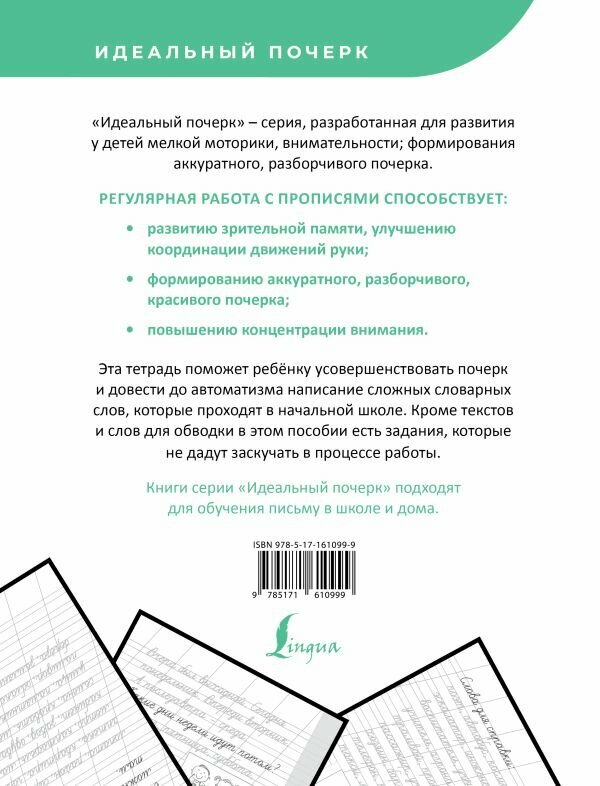 Данное пособие содержит множество словарных слов и слов-исключений, которые изучаются в курсе начальной школы на уроках русского языка. Текст напечатан "полупрозрачным" серым шрифтом. Обводя слова, ребёнок совершенствует почерк и доводит до автоматизма написание сложных примеров. В прописях строчки для обводки перемежаются заданиями и раскрасками. Читая и обводя тексты, школьник не только будет набивать руку, но и узнает интересные факты. Задания в рабочей тетради развивают мышление, эрудицию, память; предусматривают повторение и закрепление материала.Прописи предназначены для учащихся в начальной школе и соответствуют требованиям ФГОС (Федерального государственного образовательного стандарта).