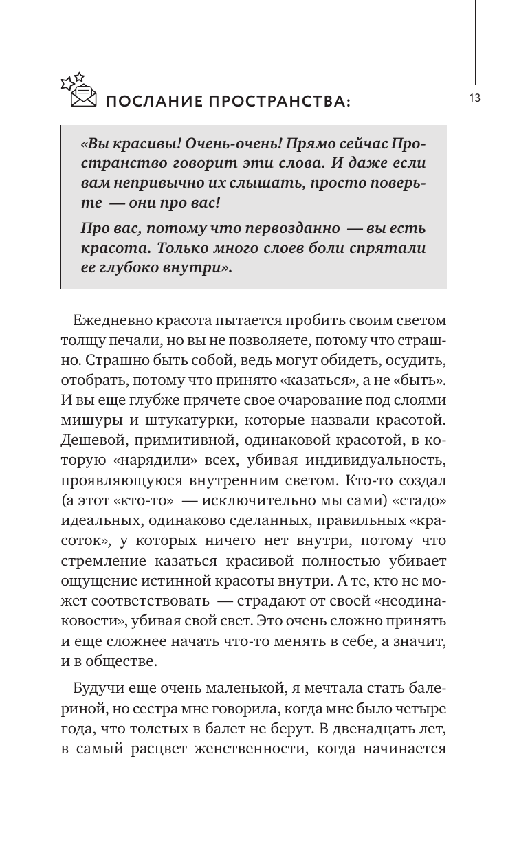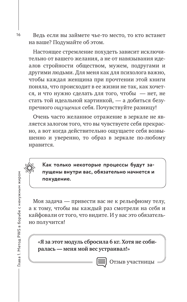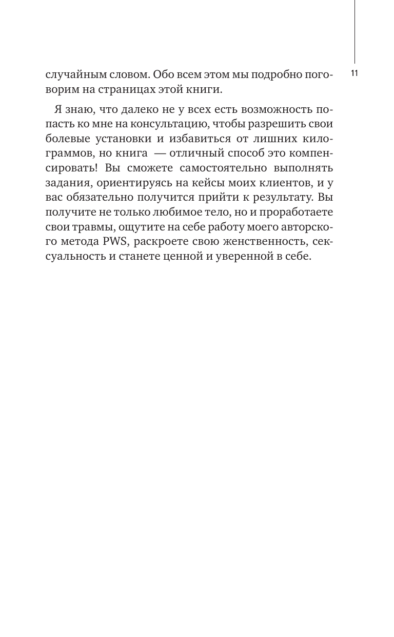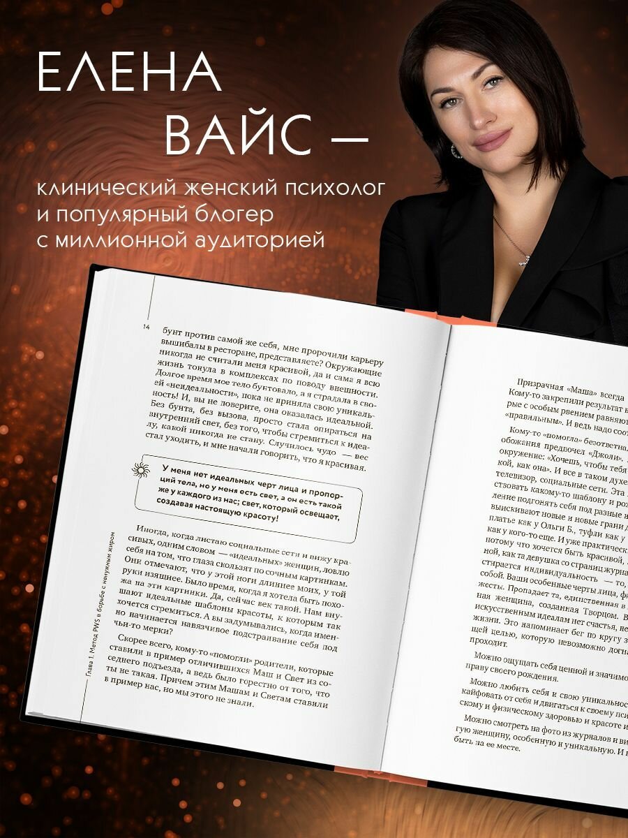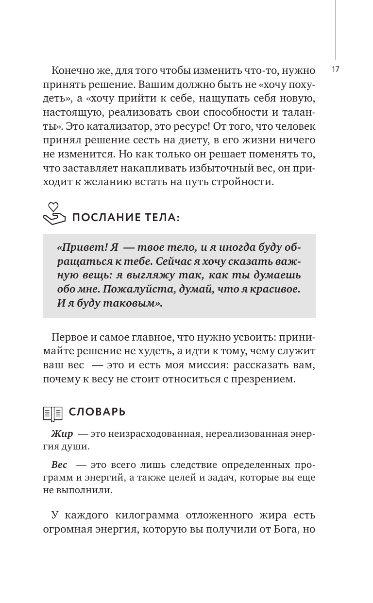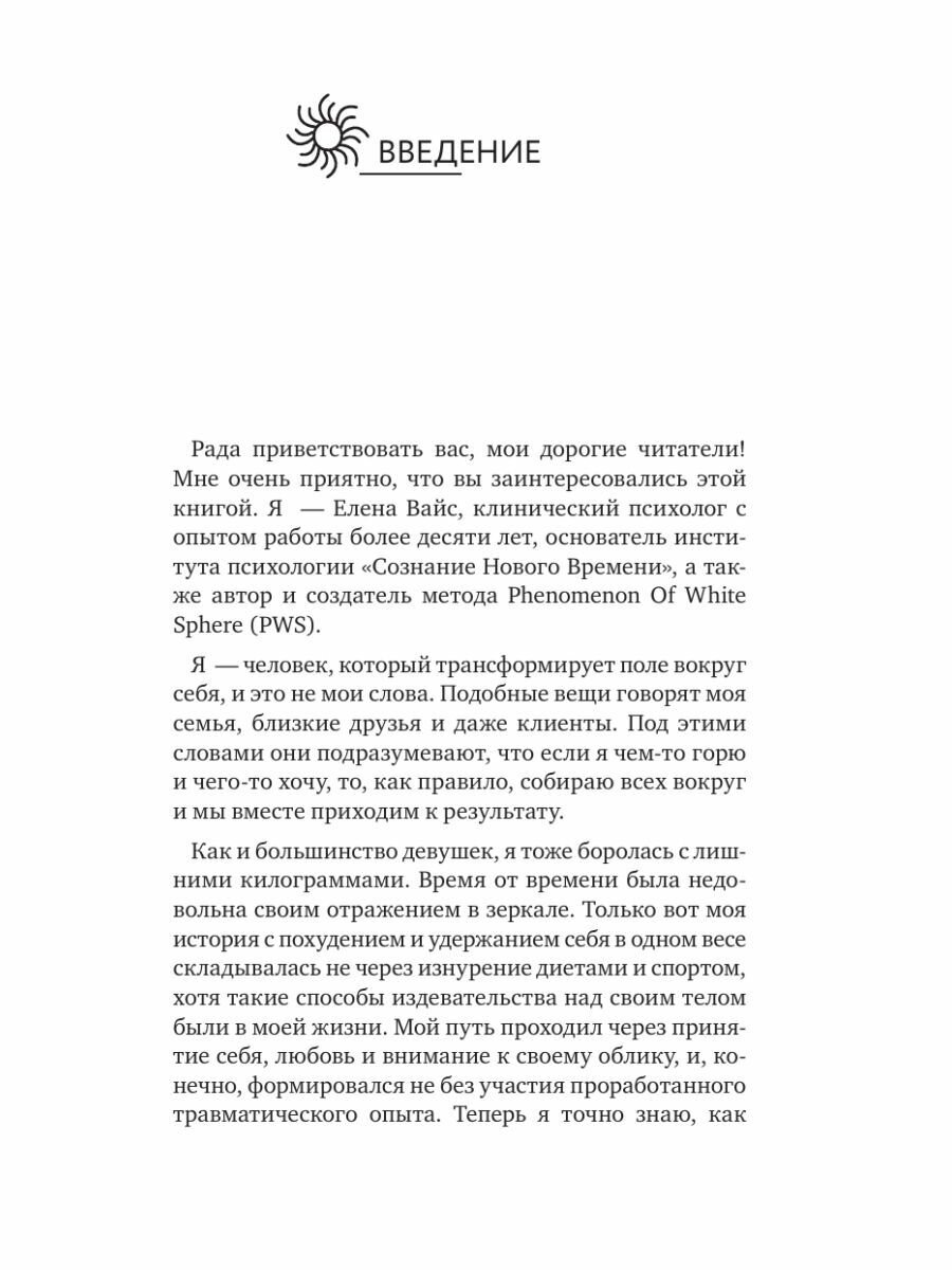 Что значат ваши лишние килограммы? Почему вы полнеете и никакие диеты не помогают? Любили ли вы свое тело по-настоящему когда-нибудь, и о чем оно пытается вам сказать... Книга известного психолога Елены Вайс, ее уникальная авторская методика, помогут вам разобратся в том, что вы прячете за лишним весом и как наладить связь между душой и и телом и как избавиться от травм и килограммов.