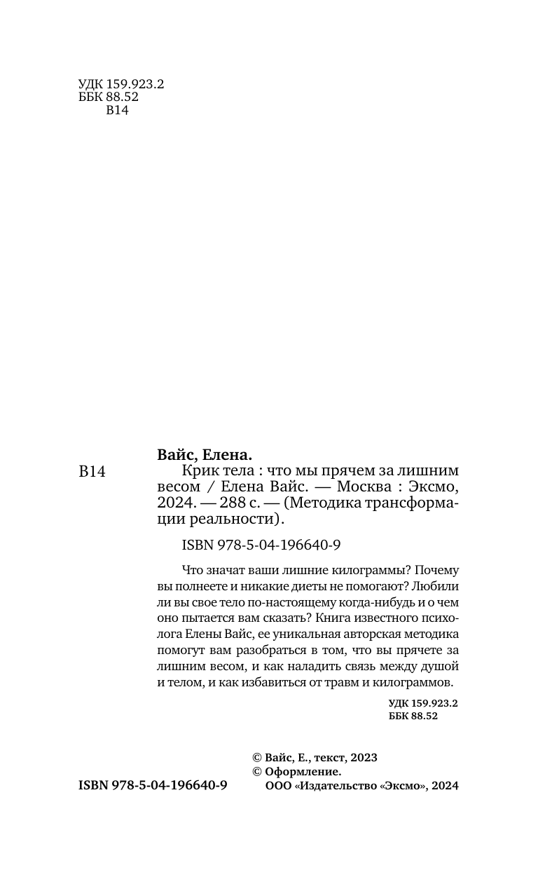 Крик тела. Что мы прячем за лишним весом (Вайс Елена); ООО "Издательство "Эксмо", 2024
