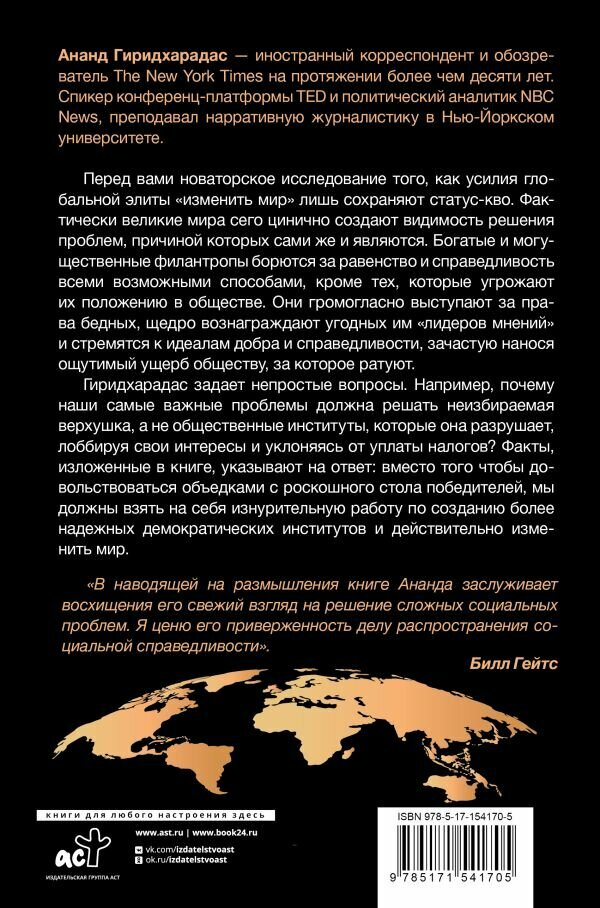 Ананд Гиридхарадас — иностранный корреспондент и обозреватель The New York Times на протяжении более чем десяти лет. Спикер конференц-платформы TED и политический аналитик NBC News, преподавал нарративную журналистику в Нью-Йоркском университете.Перед вами новаторское исследование того, как усилия глобальной элиты "изменить мир" лишь сохраняют статус-кво. Фактически великие мира сего цинично создают видимость решения проблем, причиной которых сами же и являются. Богатые и могущественные филантропы борются за равенство и справедливость всеми возможными способами, кроме тех, которые угрожают их положению в обществе. Они громогласно выступают за права бедных, щедро вознаграждают угодных им "лидеров мнений" и стремятся к идеалам добра и справедливости, зачастую нанося ощутимый ущерб обществу, за которое ратуют.Гиридхарадас задает непростые вопросы. Например, почему наши самые важные проблемы должна решать неизбираемая верхушка, а не общественные институты, которые она разрушает, лоббируя свои интересы и уклоняясь от уплаты налогов? Факты, изложенные в книге, указывают на ответ: вместо того чтобы довольствоваться объедками с роскошного стола победителей, мы должны взять на себя изнурительную работу по созданию более надежных демократических институтов и действительно изменить мир.