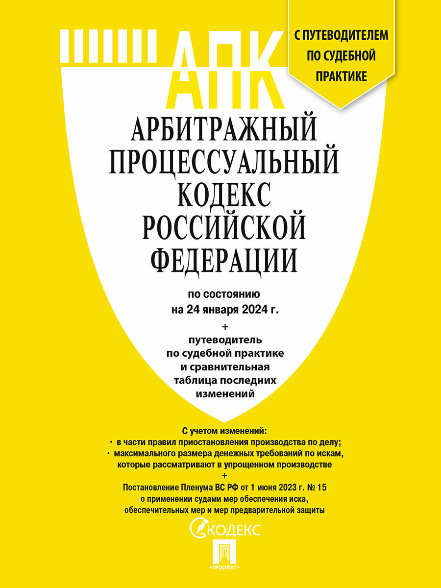 Текст Кодекса сверен с официальным источником и приводится по состоянию на 24 января 2024 г. с использованием общепринятых сокращений. Представленное вашему вниманию издание учитывает только изменения, внесенные опубликованными в официальных источниках на дату подписания издания в печать федеральными законами. Текст статей приводится на дату, обозначенную на обложке данной книги (дата актуализации). Если есть изменения, вступающие в силу позднее, то вместе с редакцией нормы, действующей на эту дату, приводится норма в новой редакции и указывается дата, с которой она вступает в силу. Издание содержит путеводитель по актуальной судебной практике Верховного Суда РФ, а также действующим постановлениям Пленума Высшего Арбитражного Суда РФ - соответствующие статьи кодекса помечены знаком, после которого приводятся название, реквизиты и пункты необходимого документа. В настоящем издании дополнительно приводится Постановление Пленума Верховного Суда РФ от 1 июня 2023 г. № 15 «О некоторых вопросах принятия судами мер по обеспечению иска, обеспечительных мер и мер предварительной защиты».