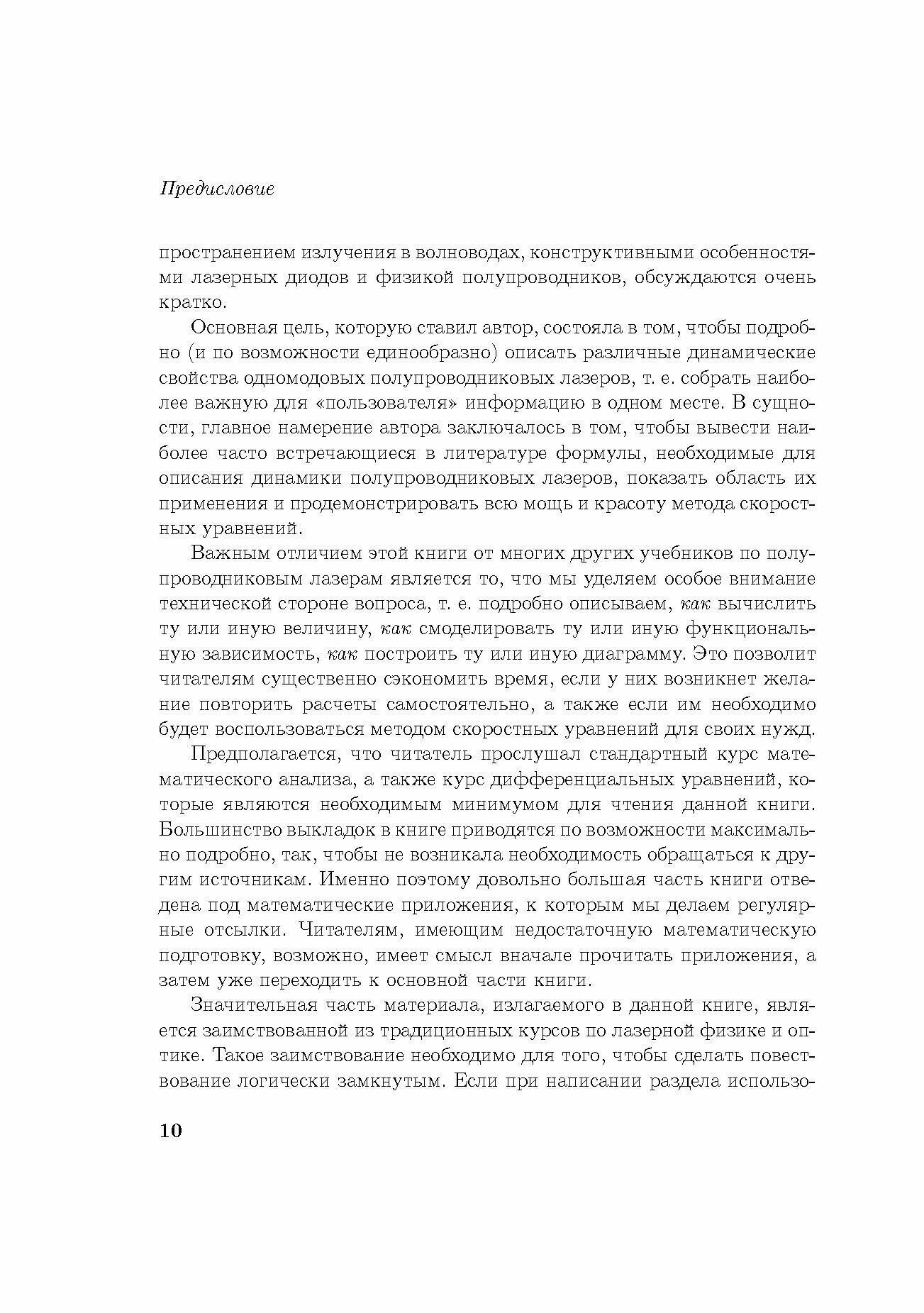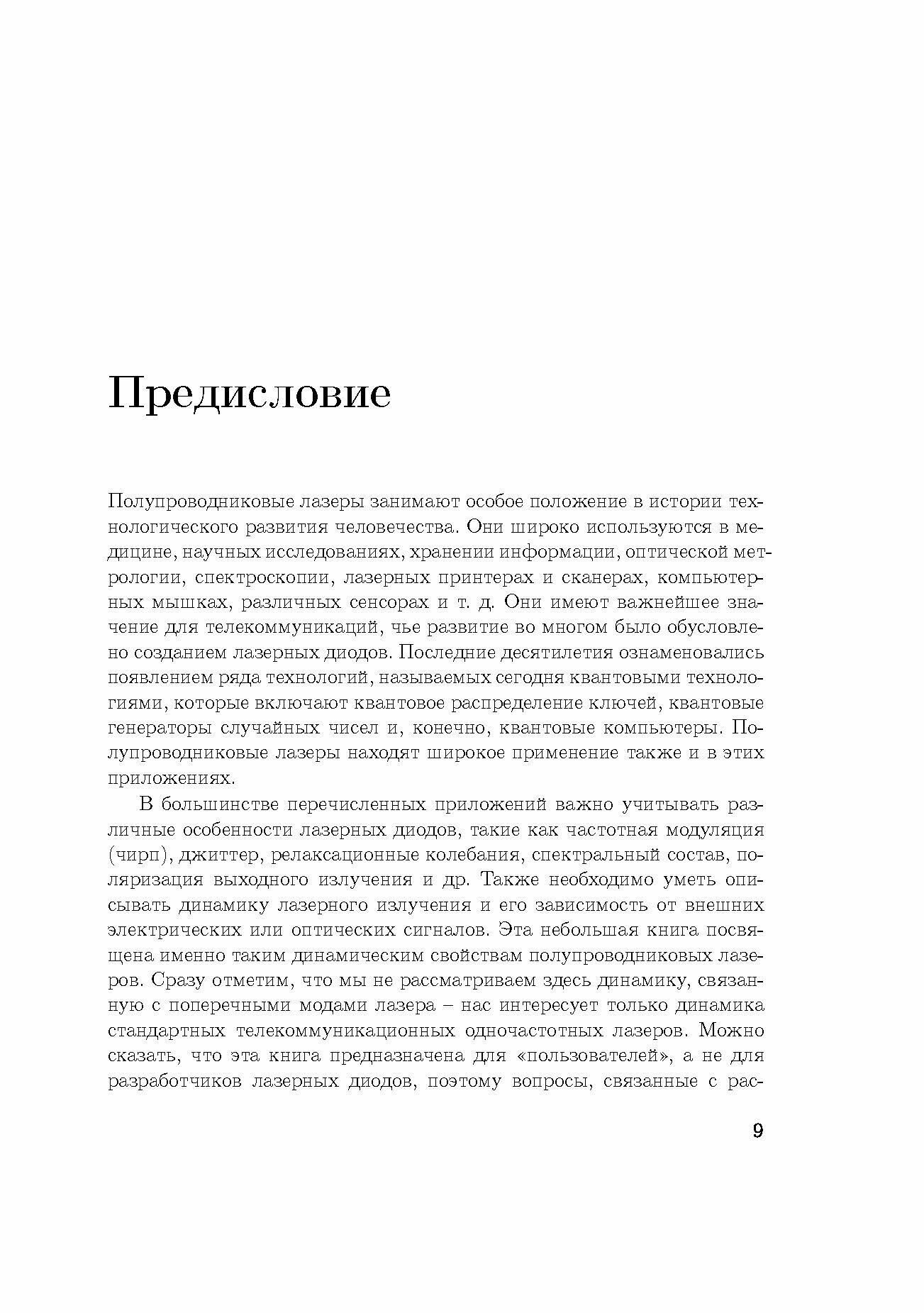Основная цель, которую ставил автор при написании книги, состояла в том, чтобы подробно (и по возможности единообразно) описать различные динамические свойства одномодовых полупроводниковых лазеров, т. е. собрать наиболее важную для «пользователя» информацию в одном месте. В сущности, главное намерение автора заключалось в том, чтобы вывести наиболее часто встречающиеся в литературе формулы, необходимые для описания динамики полупроводниковых лазеров, показать область их применения и продемонстрировать всю мощь и красоту метода скоростных уравнений. Предполагается, что читатель прослушал стандартный университетский курс математического анализа, а также курс дифференциальных уравнений, которые являются необходимым минимумом для чтения данной книги. Книга предназначена для физиков, студентов вузов технических специальностей, аспирантов и инженеров в области телекоммуникаций (в особенности в области полупроводниковых лазеров).