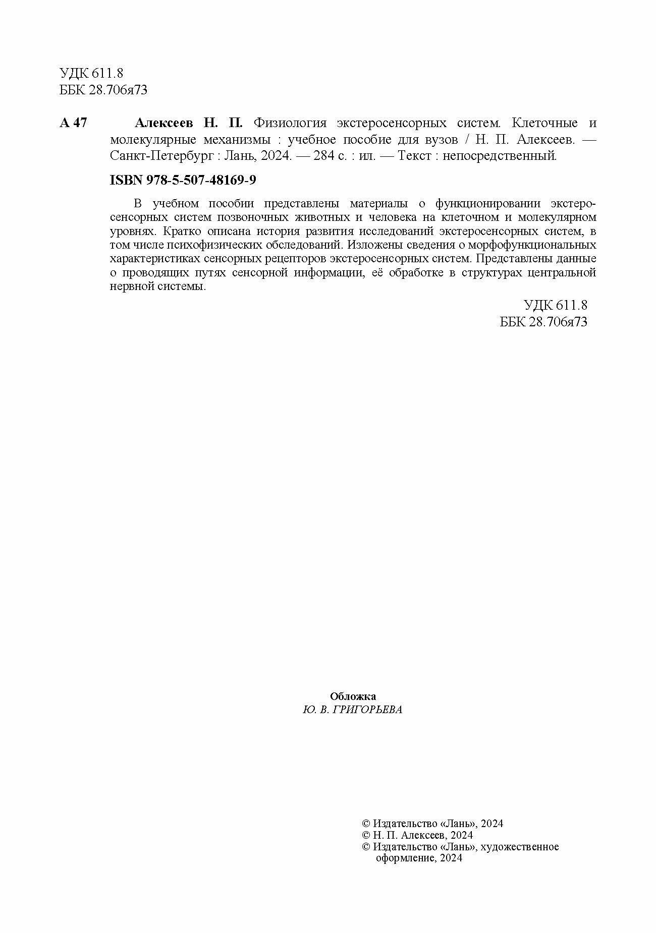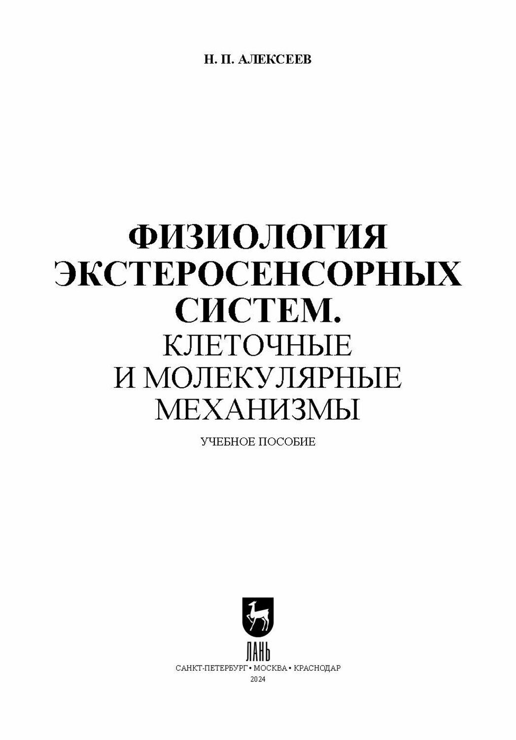 Физиология экстеросенсорных систем. Клеточные и молекулярные механизмы. Учебное пособие для вузов (Н. П. Алексеев); Издательство ЛАНЬ, 2023