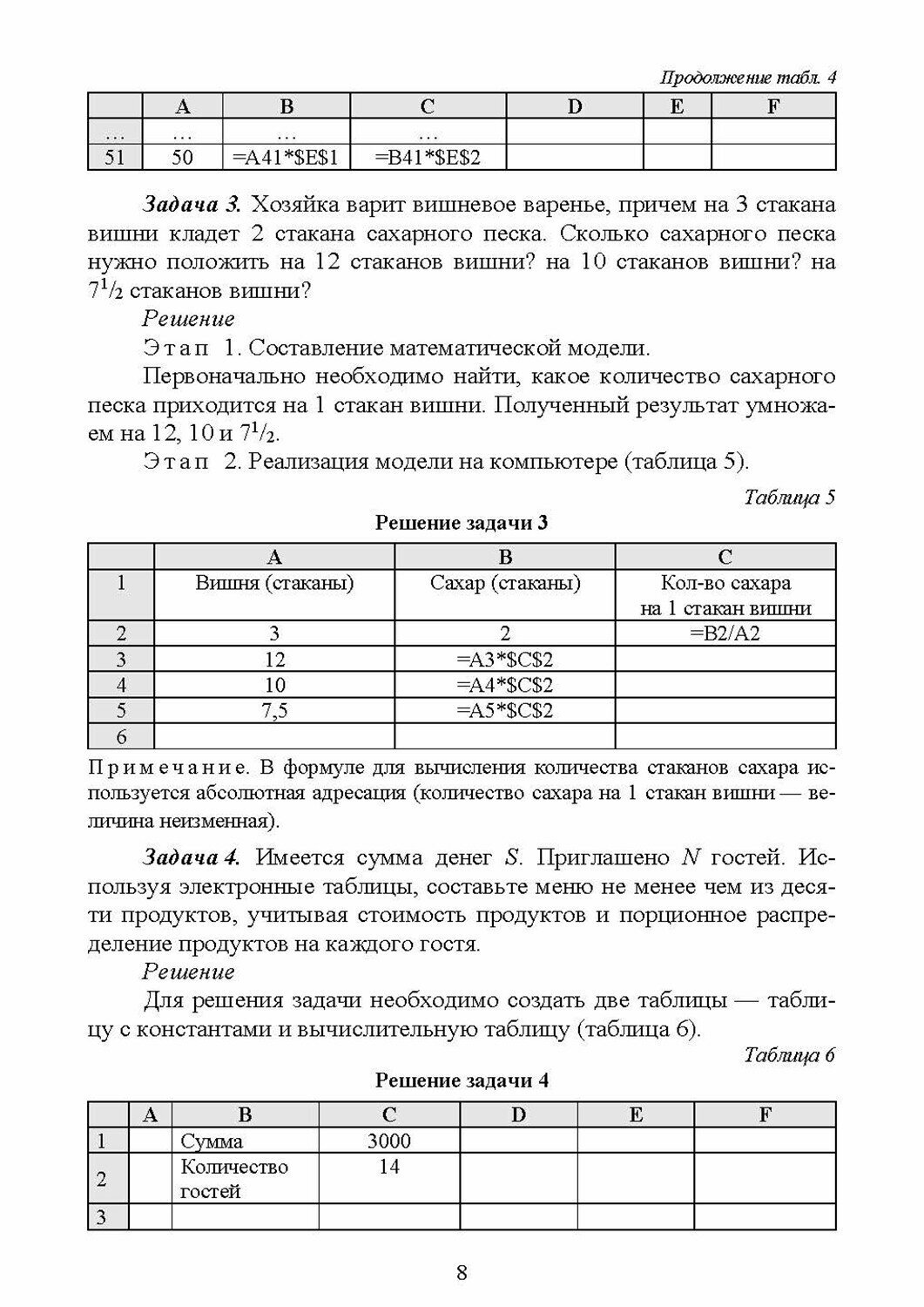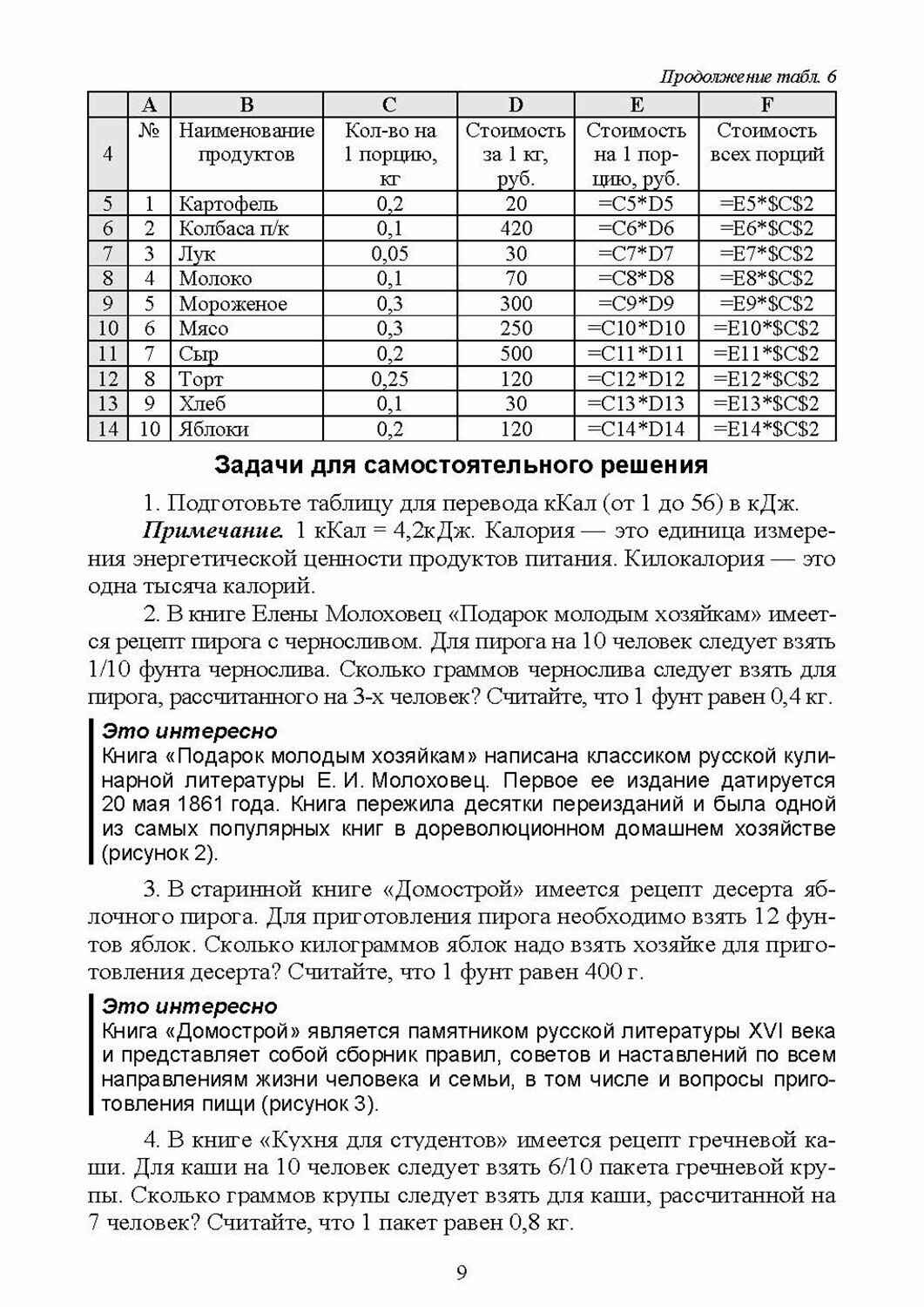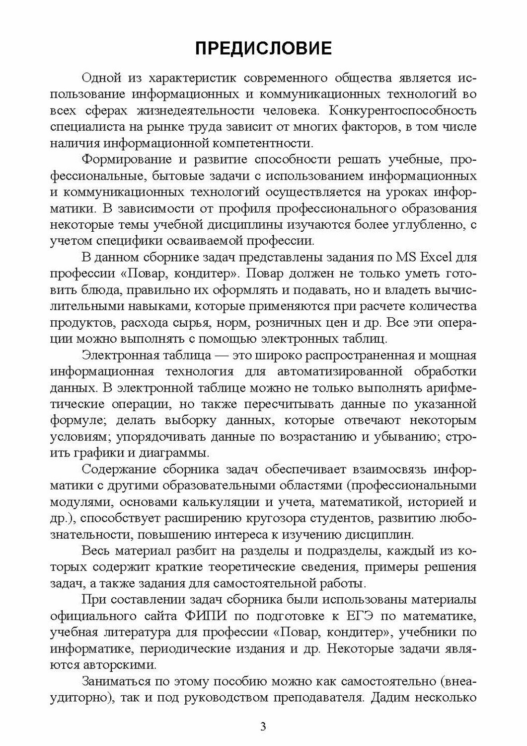 Учебное пособие содержит профессионально ориентированные задачи по информатике. Представлены задания, связанные с технологией обработки информации в электронных таблицах. Цель учебного пособия состоит в активизации и развитии навыков самостоятельной работы студентов. Весь материал разбит на разделы и подразделы, каждый из которых содержит краткие теоретические сведения, примеры решения задач, а также задания для самостоятельной работы. Соответствует современным требованиям Федерального государственного образовательного стандарта среднего профессионального образования и профессиональным квалификационным требованиям. Сборник задач предназначен для студентов СПО, обучающихся по профессии «Повар, кондитер», а также преподавателей информатики и специальных дисциплин.