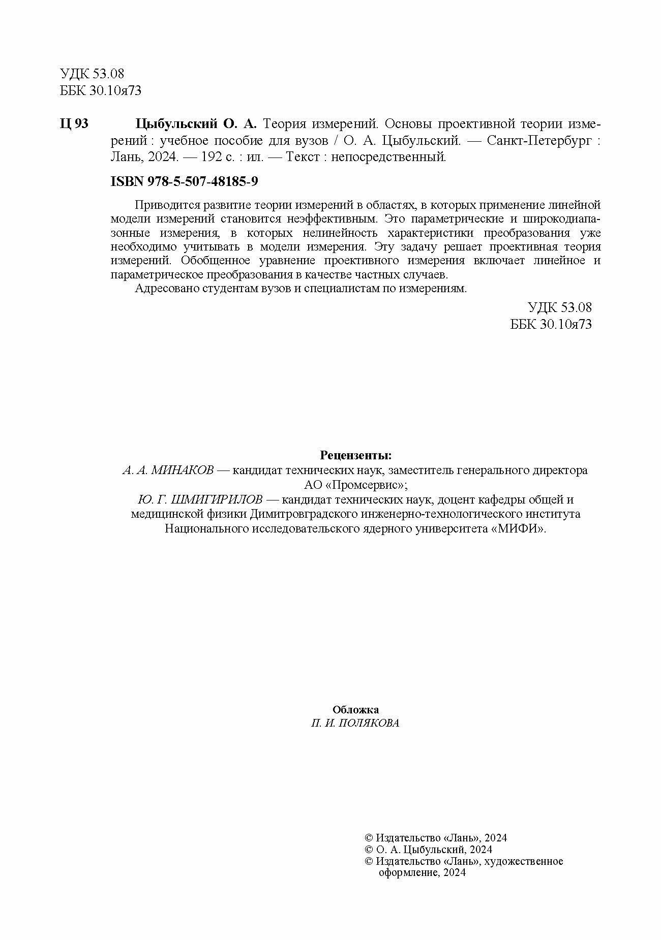 Теория измерений. Основы проективной теории измерений. Учебное пособие для вузов (Олег Цыбульский); Издательство ЛАНЬ, 2024