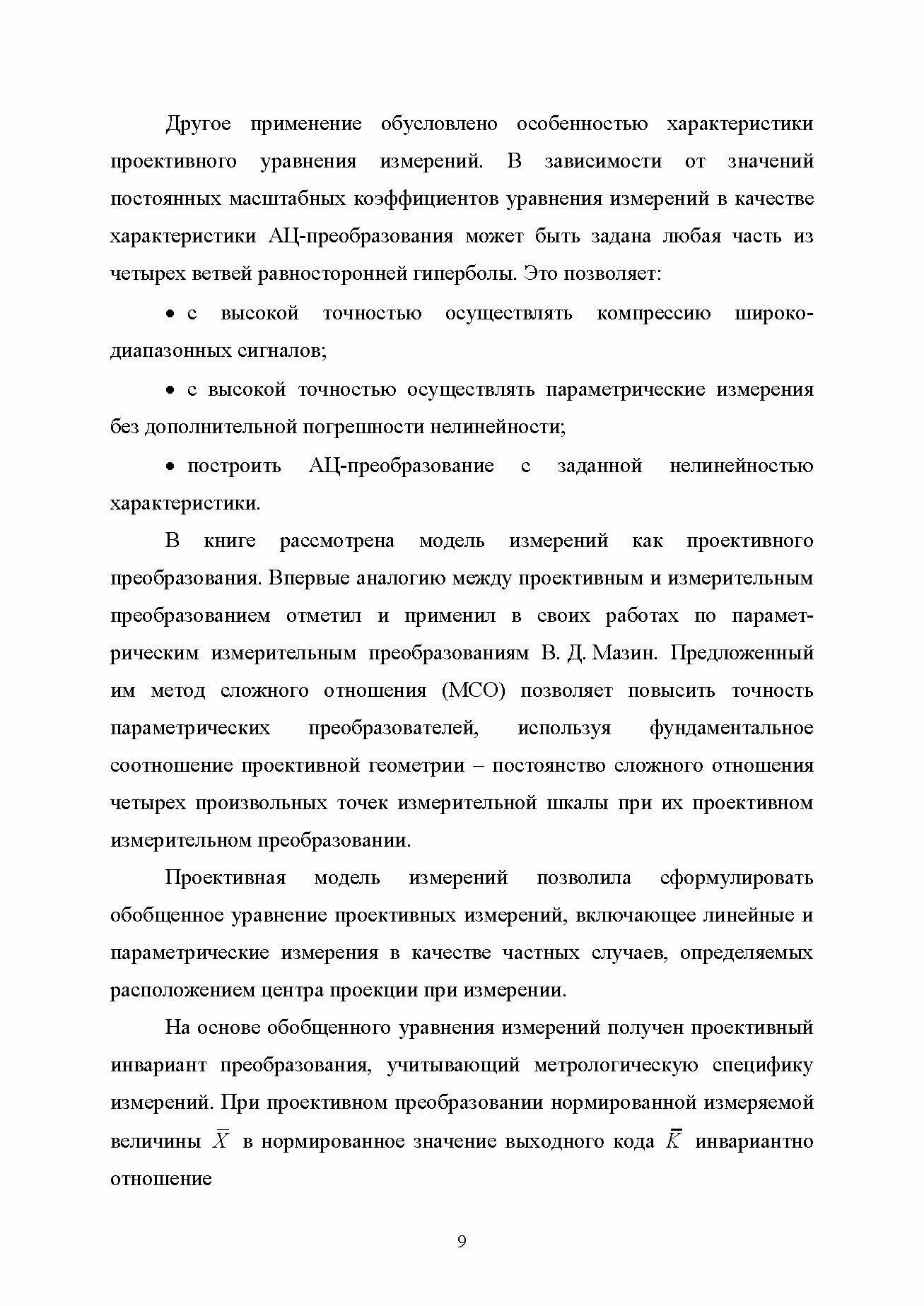 Приводится развитие теории измерений в областях, в которых применение линейной модели измерений становится неэффективным. Это параметрические и широкодиапазонные измерения, в которых нелинейность характеристики преобразования уже необходимо учитывать в модели измерения. Эту задачу решает проективная теория измерений. Обобщенное уравнение проективного измерения включает линейное и параметрическое преобразования в качестве частных случаев. Адресовано студентам вузов и специалистам по измерениям.