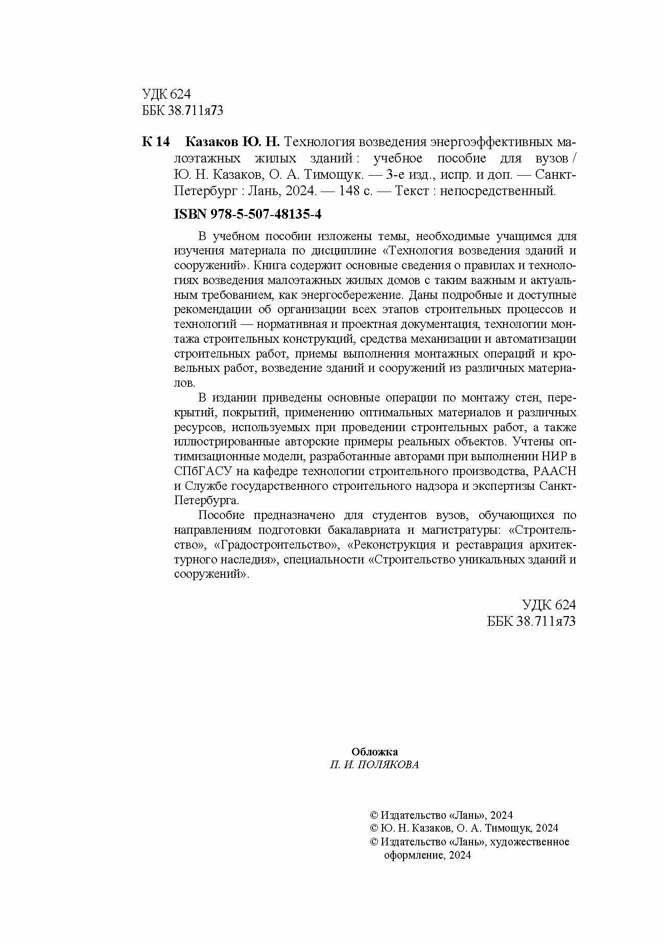 Технология возведения энергоэффективных малоэтажных жилых зданий. Учебное пособие для вузов (Казаков Юрий Николаевич, Тимощук Олег Александрович); Лань, 2024
