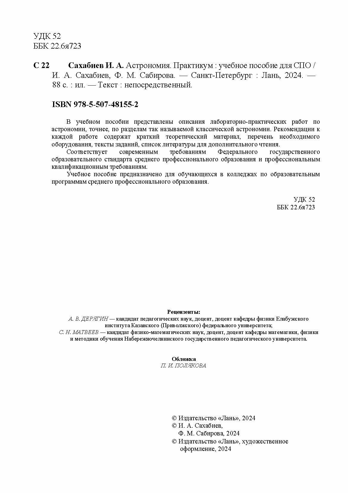 Астрономия. Практикум. Учебное пособие для СПО (Файруза Муцсовна Сабирова); Издательство ЛАНЬ, 2024