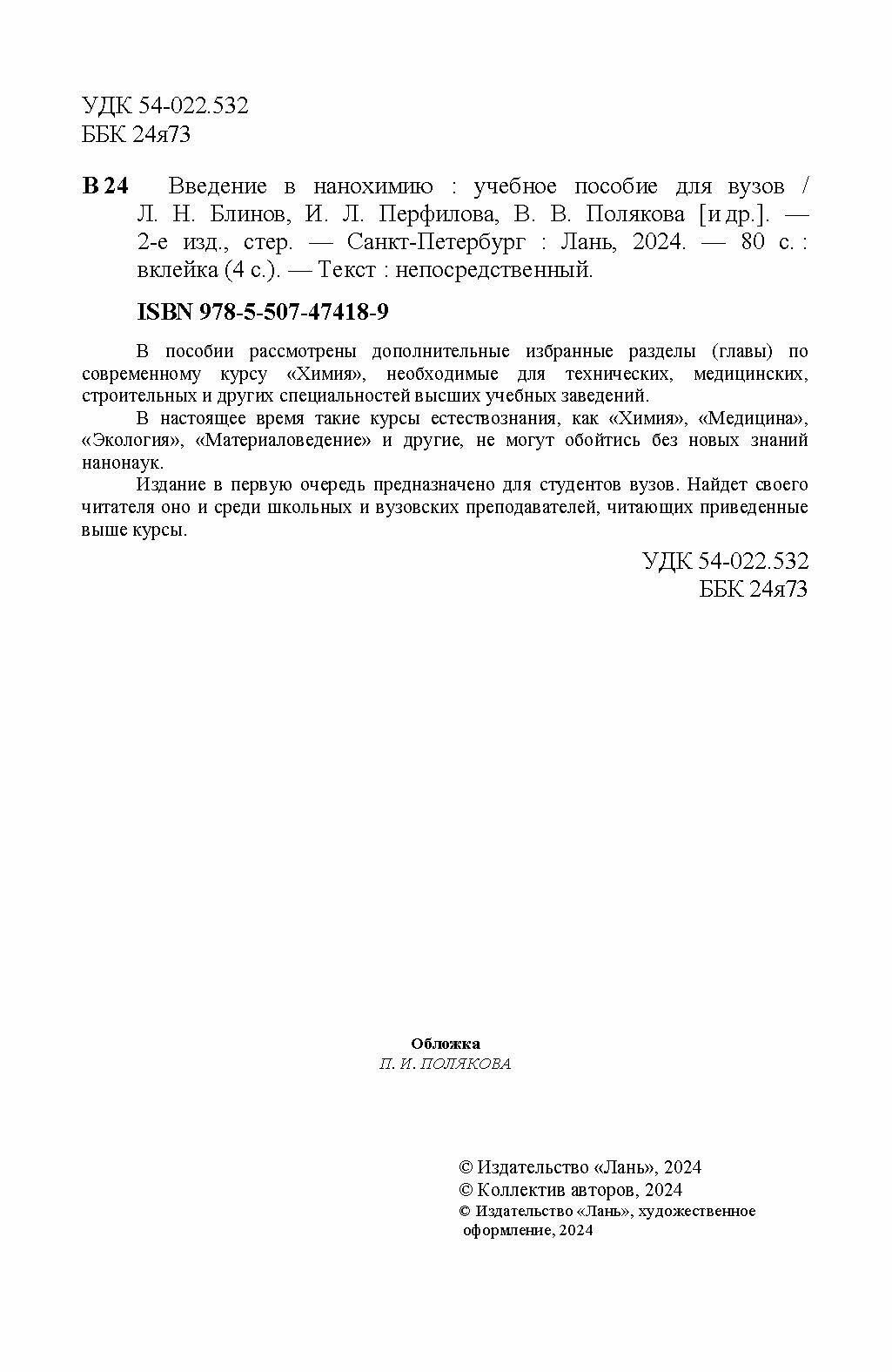 Введение в нанохимию. Учебное пособие для вузов (Блинов Лев Николаевич, Перфилова Ирина Львовна, Полякова Вера Витальевна); Лань, 2024