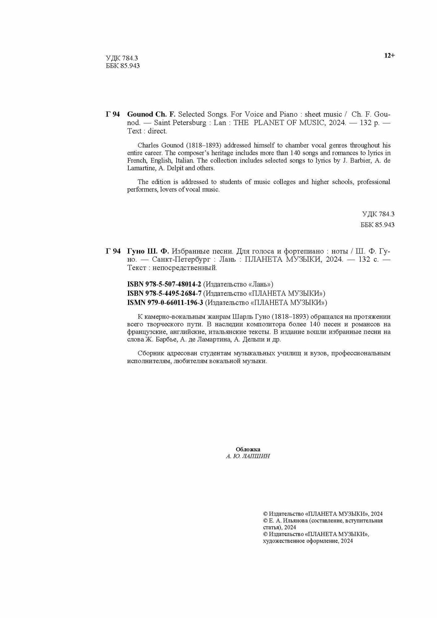 Избранные песни. Для голоса и фортепиано. Ноты (Шарль Франсуа Гуно); Издательство «Планета музыки», 2024