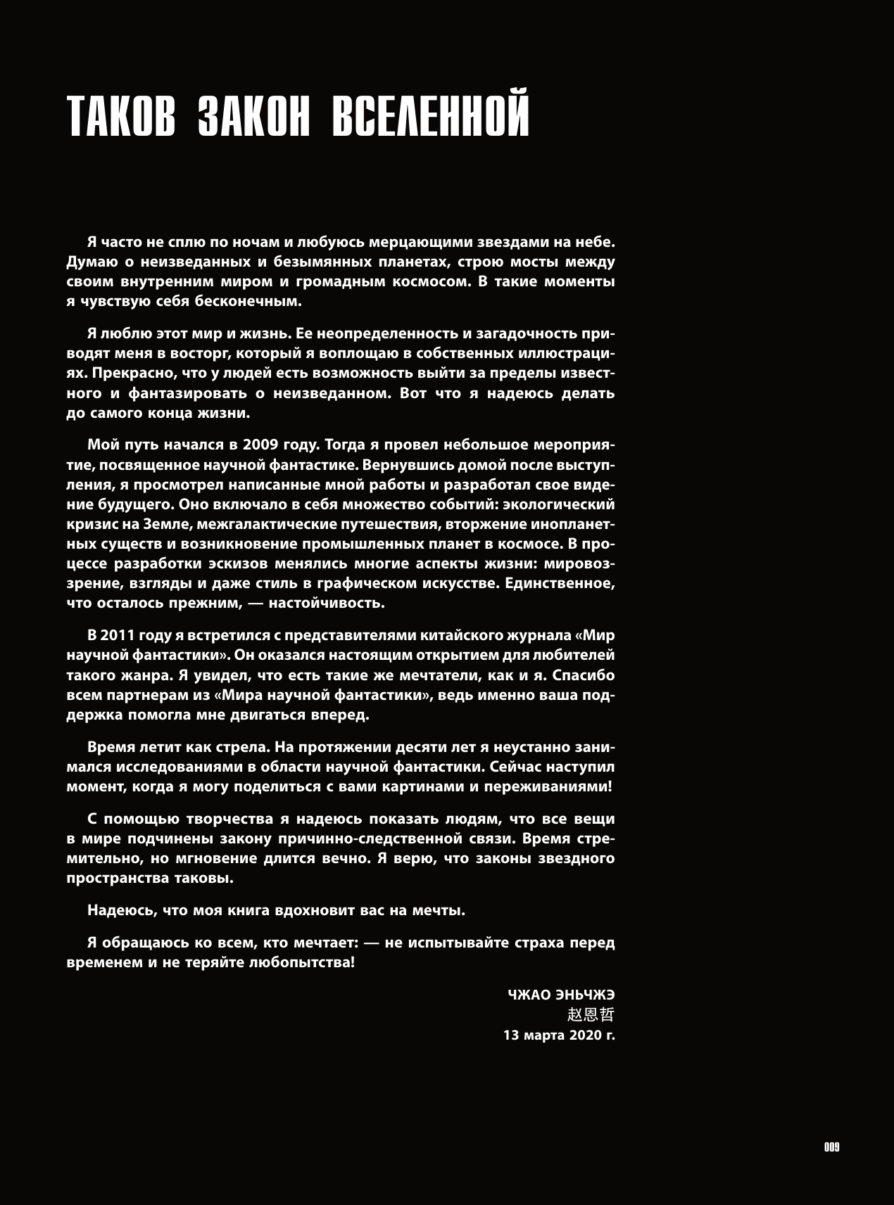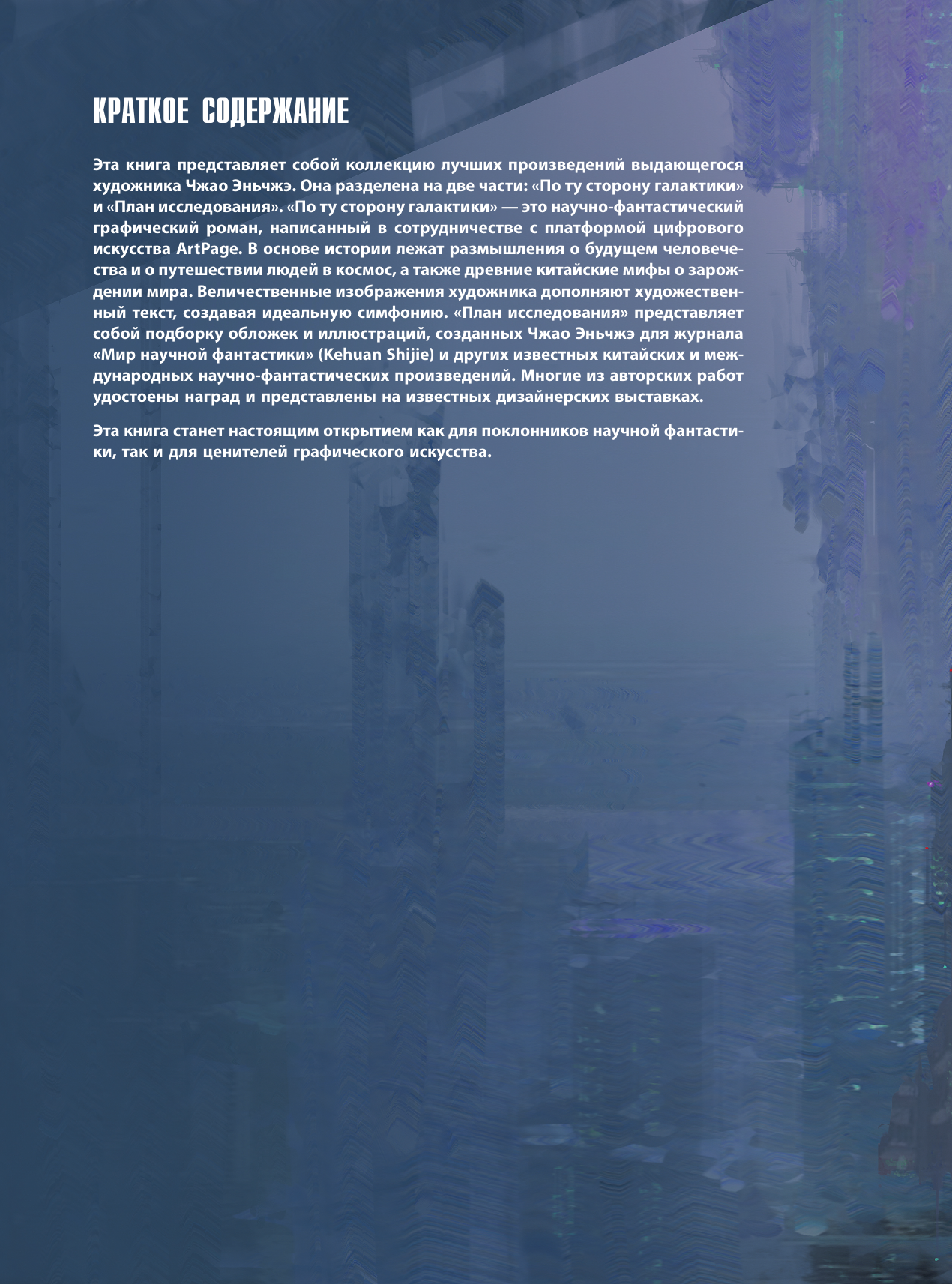 Перед вами - артбук от лауреата престижной китайской премии Galaxy Awards в области научной фантастики и обладателя "Хьюго" 2023 как лучший профессиональный художник. Под одной обложкой вас ждет и графический роман о будущем человеческой цивилизации, и коллекция избранных научно-фантастических картин за 10 лет работы. Чжао Эньчжэ - современный игровой продюсер, sci-fi иллюстратор, концепт-дизайнер игр и фильмов. Обладатель серебряной награды за лучшее художественное оформление на 7-м Всемирном китайском конкурсе научной фантастики Nebula Awards, а также целого ряда других наград.