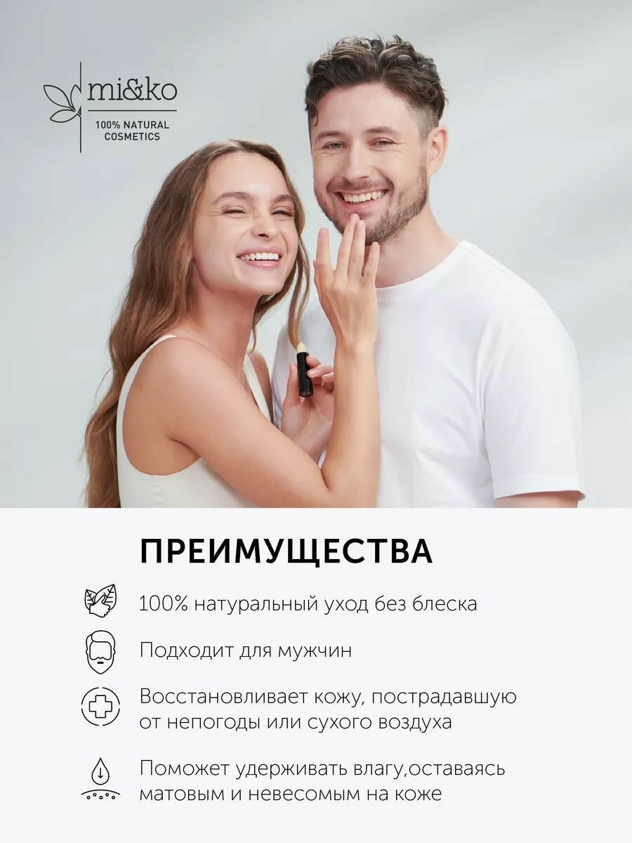 Самый незаметный бальзам для губ — для сторонников нюда, минимализма и конечно, для мужчин! Если вам нужен 100% натуральный уход без блеска, эффект «губ без помады» — это решение для вас. Масла жожоба, ши, авокадо, шиповника восстановят кожу, пострадавшую от непогоды или сухого воздуха. Природный воск поможет удерживать влагу, а экстракты женьшеня и облепихи подарят упругость и здоровое сияние. Комфортный в нанесении бальзам обеспечивает увлажнение губ, оставаясь матовым и невесомым на коже. Невидимая защита и комфорт в течение дня!