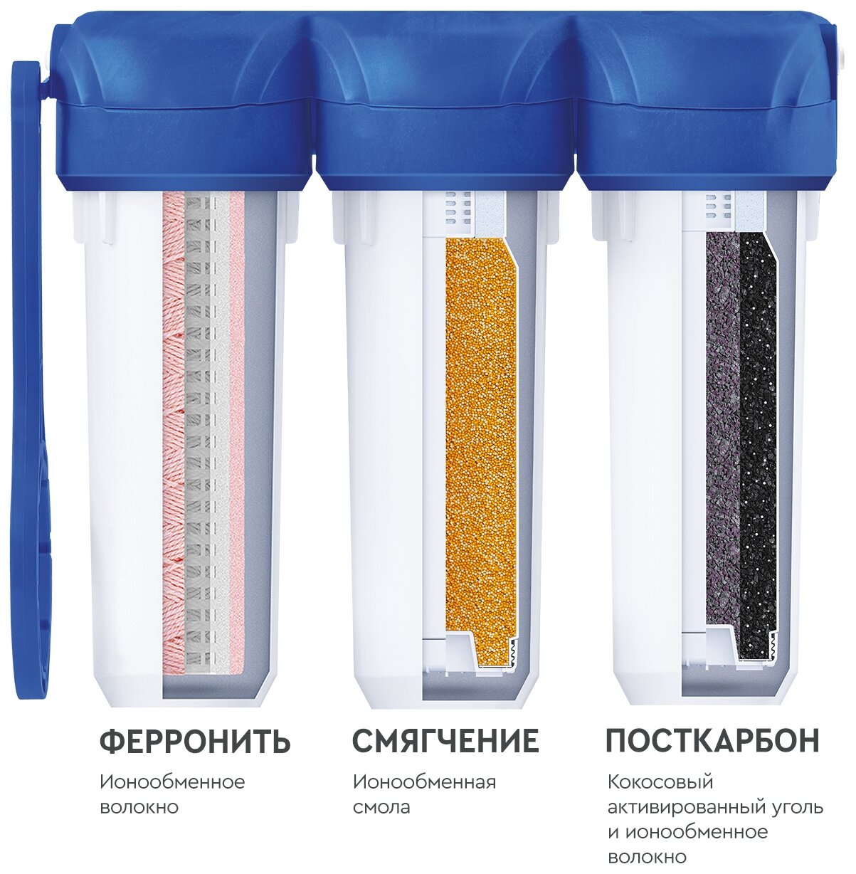 | Тип фильтра(ов) | угольный (сорбционный), механический, обезжелезивающий, ионообменный (умягчение) |