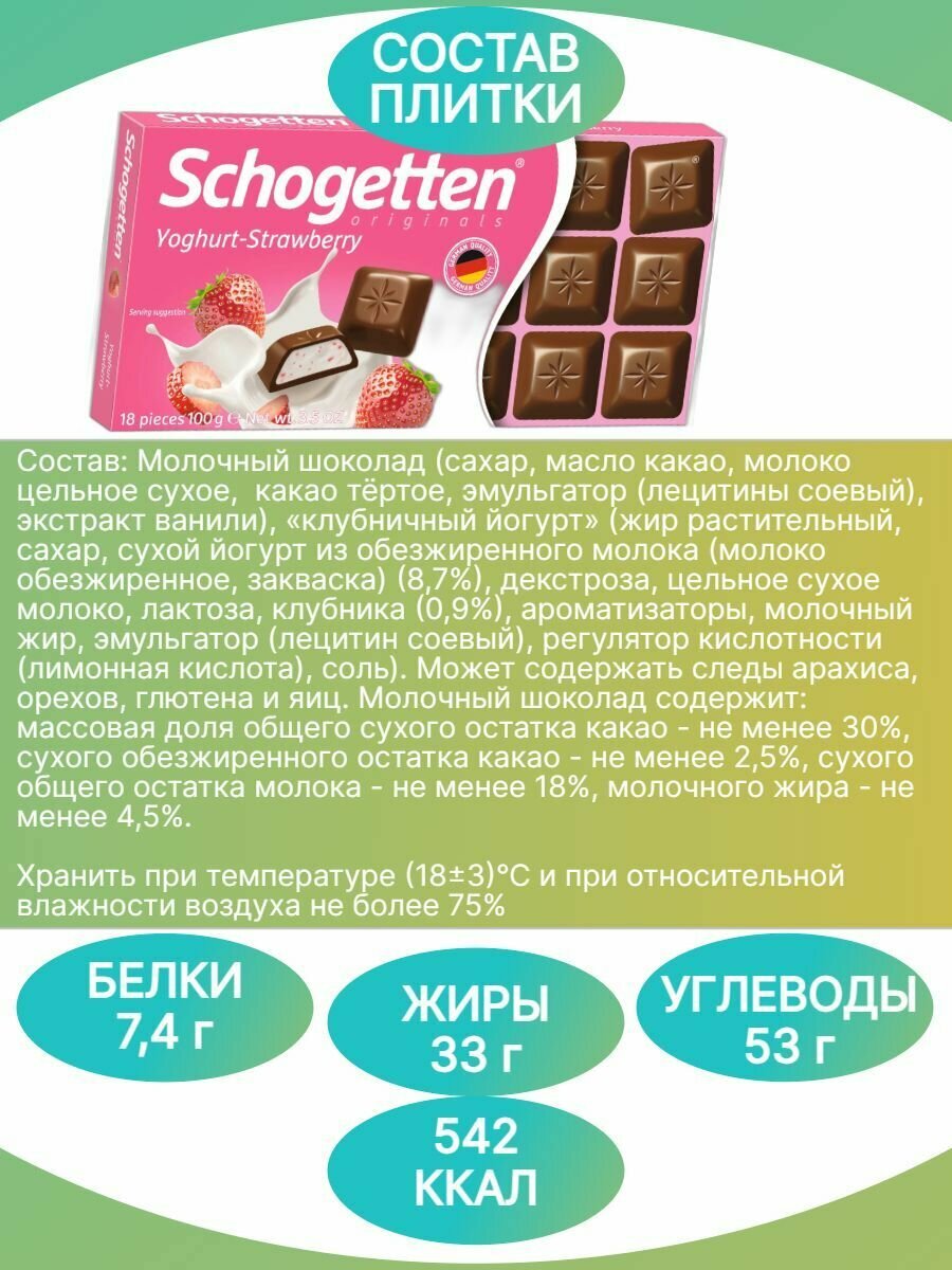 Легкая клубничная кислинка дополняет сладкий шоколадный вкус, поэтомушоколад Schogetten Yoghurt-Strawberry не приторный, а нежный и легкий.