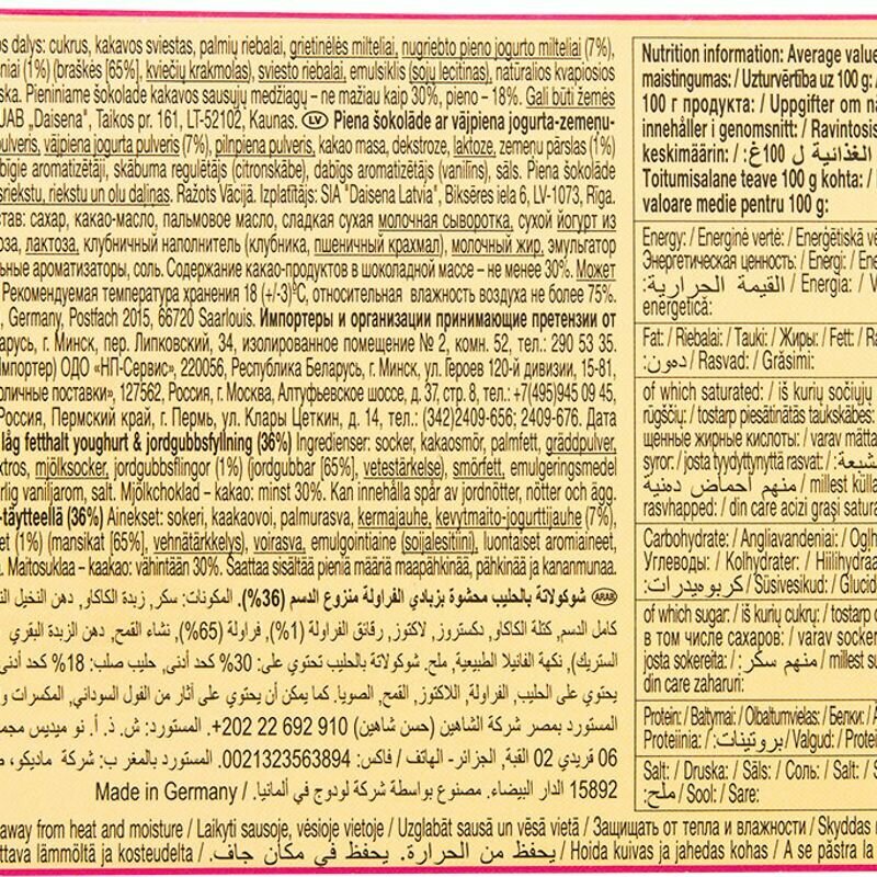 | Состав | сахар, масло какао, пальмовое масло, сладкая сухая молочная сыворотка, сухой йогурт из обезжиренного молока, цельное сухое молоко, какао тертое, декстроза, лактоза, клубничный наполнитель (клубника, пшеничный крахмал), молочный жир, эмульгатор (соевый лецитин), регулятор кислотности (лимонная кислота), натуральные ароматизаторы, соль. |