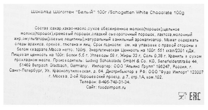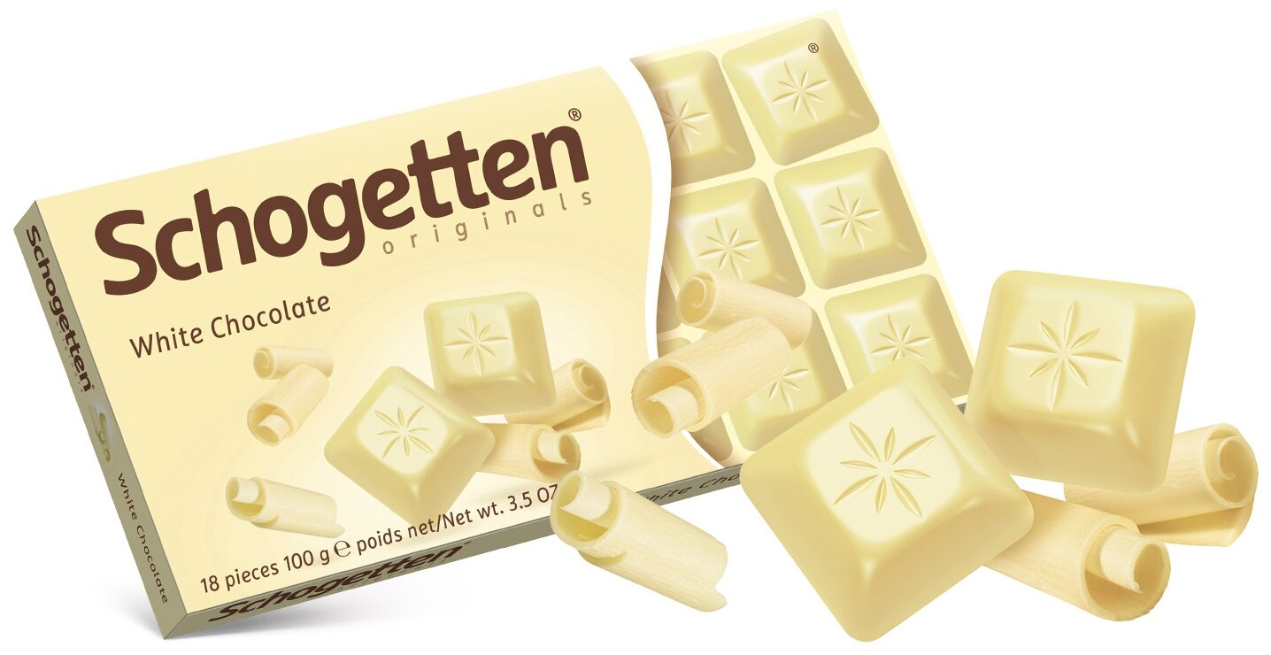 Шоколад Schogetten White это вкусный и качественный немецкий шоколад. Уникальность этого шоколада не только в его рецептуре, но и в форме. В упаковке вы не найдете цельной плитки: она уже поделена на аккуратные квадратные ломтики с фирменным оттиском, разложенные на плотной картонной подложке. Такие кусочки удобно не только есть, но и подавать к чайному столу - их можно выложить в вазочку как оригинальные шоколадные конфеты.