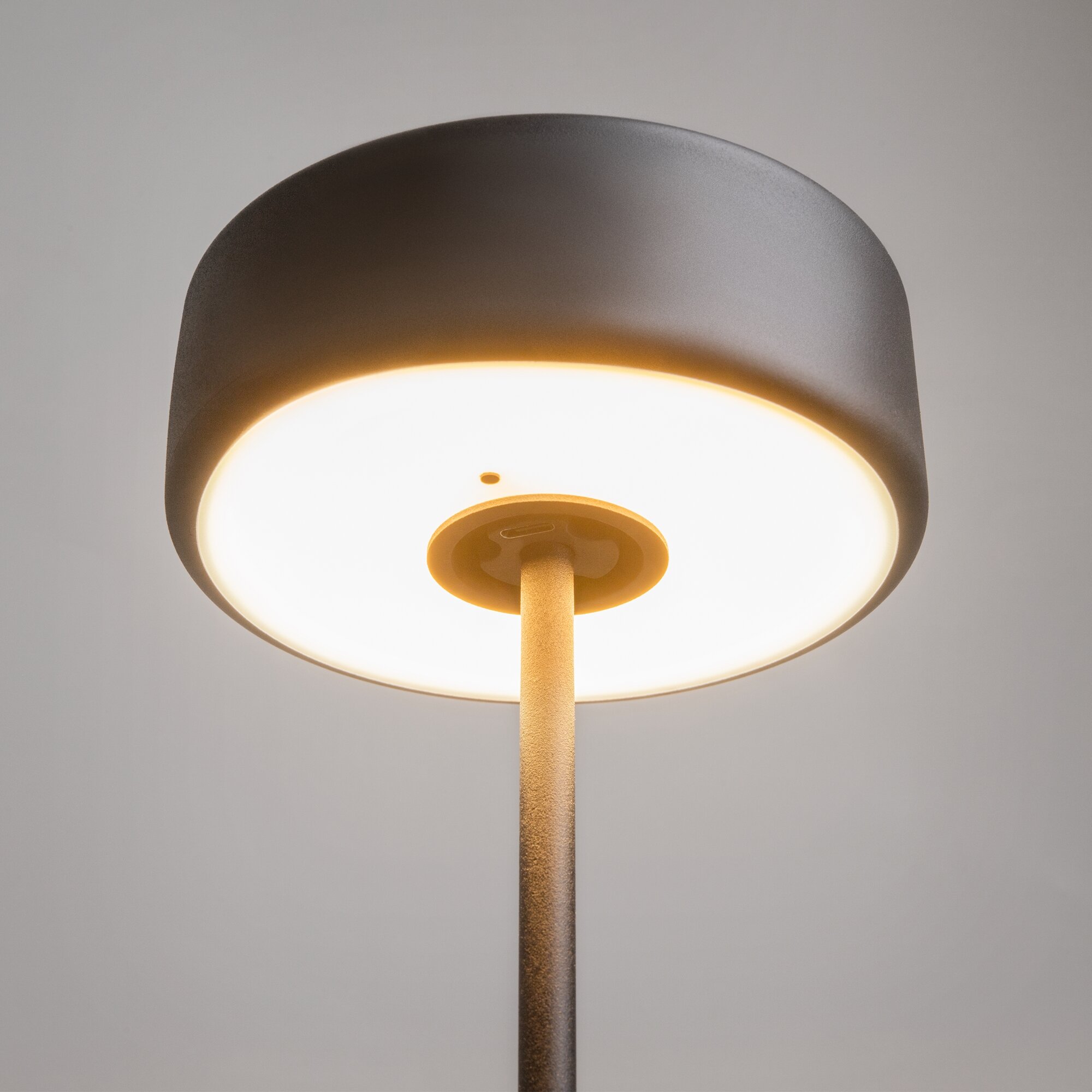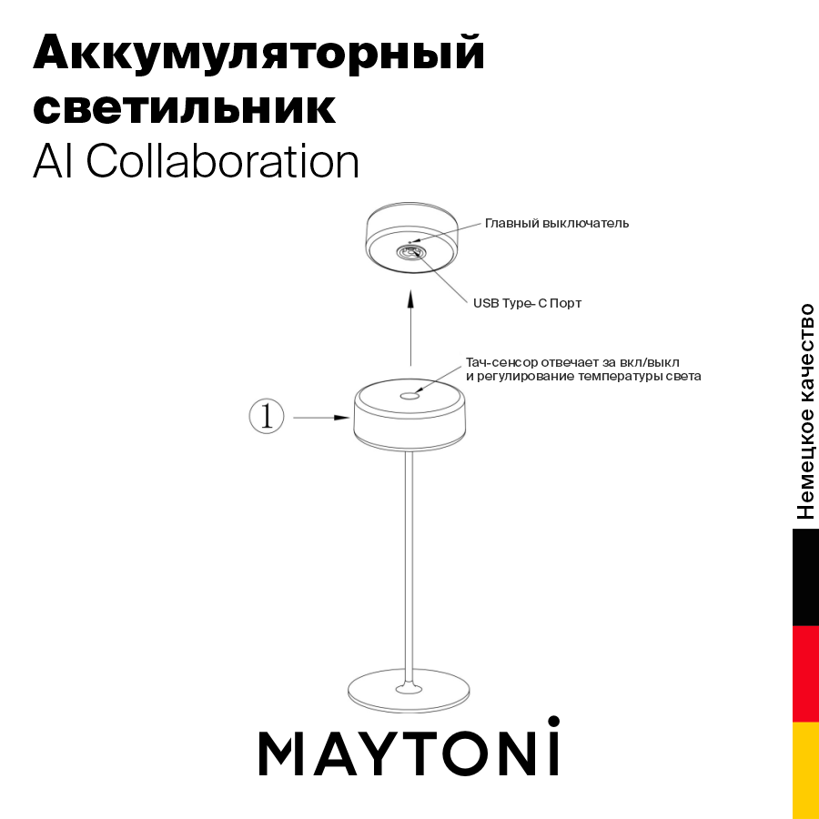 Портативный настольный светильник. Результат творческой коллаборации искусственного интелекта и предметного дизайнера. Два варанта корпуса светильника: с металлической тонкой ножкой на плоском круглом основании; со стеклянным основанием с интегрированной вазой. Плафон снимается с основания для удобного ухода за стеклянными элементами и подзарядки аккумулятора, расположенного в плафоне. Два варианта цвета стеклянных моделей - прозрачный и серый. Плафоны с рассеивателем из акрила в 3х цветах: черный, золотой, белый. Удобный сенсорный выключатель вверху плафона. Micro USB разъем для подзарядки скрыт в нижней части плафона. LED-источник света. Регулируемая цветовая температура от 2200К до 4000К.