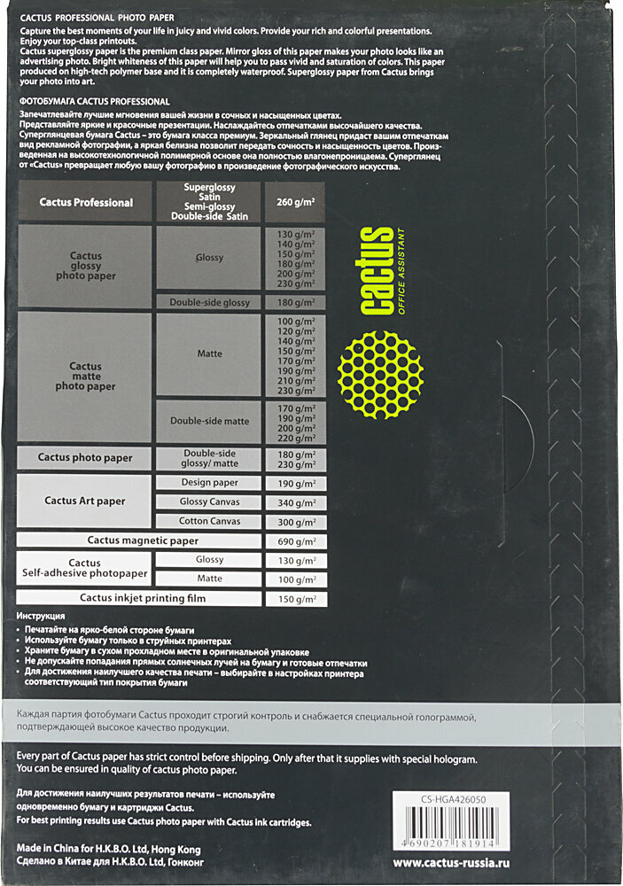 Фотобумага серии Cactus Professional - это бумага класса премиум. Незаменима для печати цифровых фотографий с максимальным разрешением.