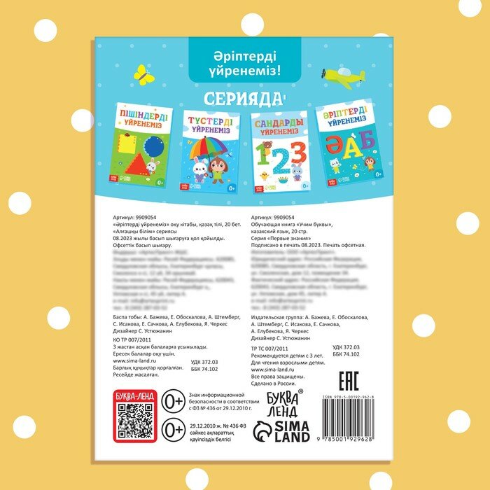 Обучающая книга "Учим буквы", казахский язык, 20 стр.. С обучающей книгой на казахском языке из серии «Первые знания» ребёнок в лёгкой игровой форме познакомится с буквами и разными предметами и явлениями, с которыми он сталкивается каждый день.Чтобы занятия проходили продуктивно, проводите их, когда у вас и ребёнка хорошее настроение и вы готовы к совместному творчеству.Особенности книгиИздание небольшого размера удобно брать с собой и заниматься дома.В книге 20 страниц.Яркие цвета и забавные герои привлекут внимание и заинтересуют малыша.Книги подходят для занятий с детьми старше 3 лет.В серии книг на казахском языке «Первые знания» представлены и другие книги — соберите их все.(9909054)
