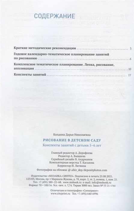 Рисование в детском саду. Конспекты занятий с детьми. 5–6 лет. ФГОС. ФОП Пособие издано в рамках учебно-методического комплекта к программе «ОТ РОЖДЕНИЯ ДО ШКОЛЫ». В данном пособии представлены конспекты занятий с детьми 5-6 лет по рисованию гуашевыми и акварельными красками, цветными карандашами и восковыми мелками традиционными и нетрадиционными способами. Эти занятия способствуют положительной эмоциональной отзывчивости у детей к окружающему миру, развитию самостоятельности, настойчивости, аккуратности, трудолюбия, умения доводить работу до конца, формированию изобразительных навыков и умений. Представленные в пособии конспекты занятий разработаны в рамках вариативности программы «ОТ РОЖДЕНИЯ ДО ШКОЛЫ» и помогут педагогу разнообразить занятия с детьми. Занятия составлены по тематическому принципу: одна тема объединяет все занятия по лепке, аппликации, рисованию в течение недели. Книга содержит: • краткие методические рекомендации; • ожидаемые образовательные результаты; • годовое календарно-тематическое планирование; • комплексное тематическое планирование; • конспекты занятий. Книга адресована воспитателям и родителям.