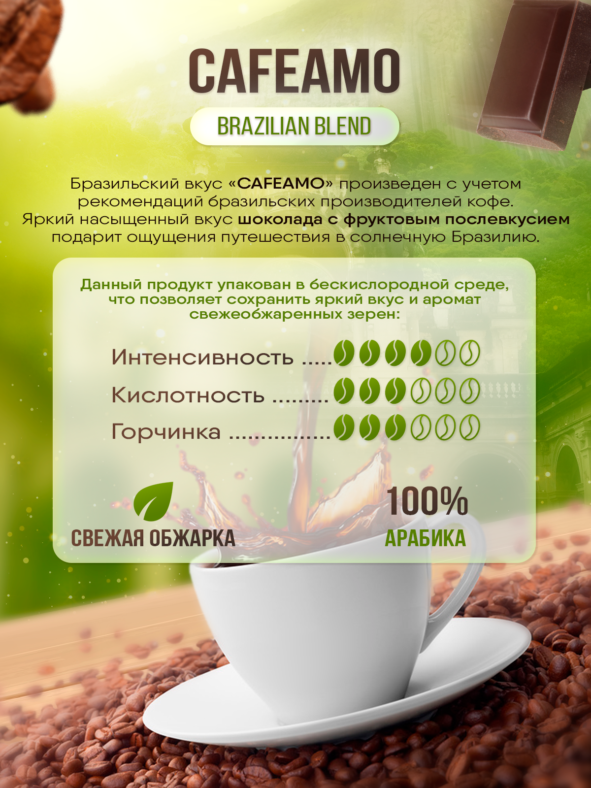 Бразильский вкус "Cafeamo" произведен с учетом рекомендаций ведущих бразильских производителей кофе. Имеет яркий насыщенный вкус шоколада с фруктовым послевкусием, подарит ощущения путешествия в жаркую солнечную Бразилию.