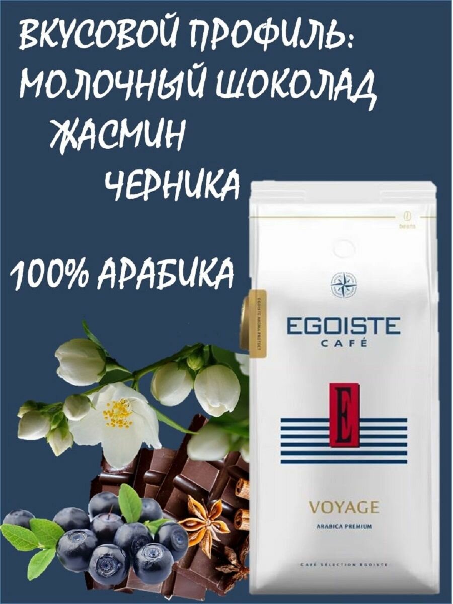 EGOISTE Voyage — бленд премиальной арабики из Эфиопии, Бразилии и Перу c изысканным и гармоничным вкусовым профилем. Зёрна из Бразилии и Перу — cбалансированная кофейная основа, которая оставляет приятное шоколадное послевкусие. Зёрна из Эфиопии дополняют смесь яркими ягодными и цветочными нотами, открывая новые грани вкусового опыта.Средняя обжарка деликатно подчёркивает сладкие ноты спелой черники, насыщенный аромат жасмина и послевкусие молочного шоколада.Кофе Эгоист Вояж в зернах относится к премиальному сегменту. Производят напиток в нескольких европейских странах. На всех этапах производства четко соблюдаются правила работы с кофейными зернами. Контроль качества постоянный.Эгоист обладает насыщенным вкусом и приятным ароматом, который ощущается сразу же после заваривания.Чашечка ароматного кофе поможет взбодриться утром и восстановить силы в течение рабочего дня. Подавать его можно соло, со сладкими блюдами или бутербродами. Любители натуральных вкусов предпочитают употреблять его несладким. Те, кто предпочитает приглушить характерную горчинку, могут добавить в него подсластители (сахар, сахарозаменители, сиропы, мед).Чтобы получить вкусную крепкую пенку, используется молоко или сливки. Если добавить немного мороженого, получится освежающий глясе.Долька лимона добавит легкую кислинку, корица сделает напиток пикантным. Разные специи и пряности помогут открыть новые оттенки вкуса.Готовый кофе можно использовать для приготовления коктейлей.