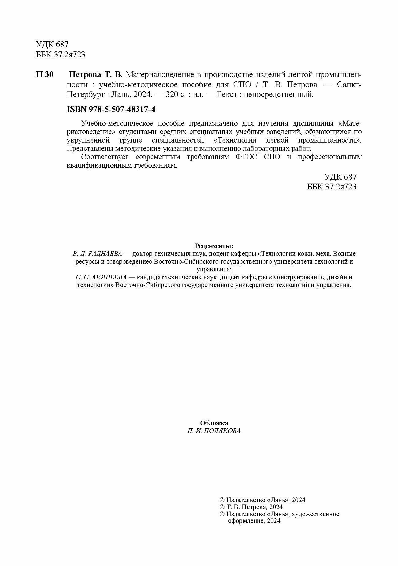 Материаловедение в производстве изделий легкой промышленности. Учебно-методическое пособие для СПО (Петрова Татьяна Владимировна); Лань, 2024