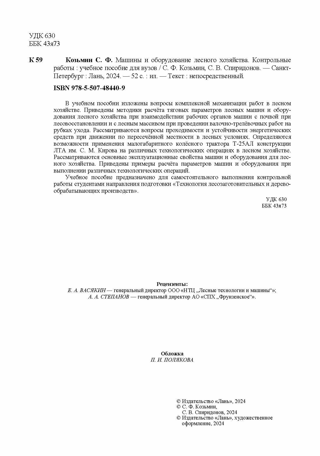 Машины и оборудование лесного хозяйства. Контрольные работы. Учебное пособие для вузов (С. Ф. Козьмин); Издательство ЛАНЬ, 2024
