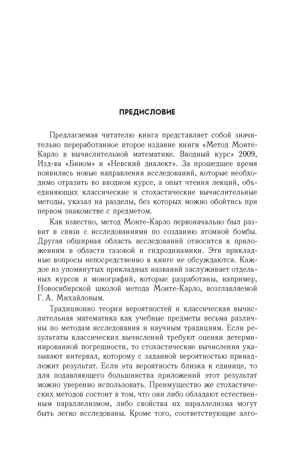 Книга посвящена быстро развивающемуся методу решения широкого круга прикладных задач - методу Монте-Карло. Автор известен своими исследованиями в этой области. Настоящая книга может служить кратким и достаточно строгим введением в предмет. Вместе с тем она включает ряд новых результатов, относящихся к природе стохастических вычислительных методов, по сравнению их с детерминированными аналогами и свойствам их параллелизма. Книга адресована широкому кругу читателей, интересующимся современными проблемами математического моделирования и вычислительной математики. 2-е издание, исправленное и дополненное.
