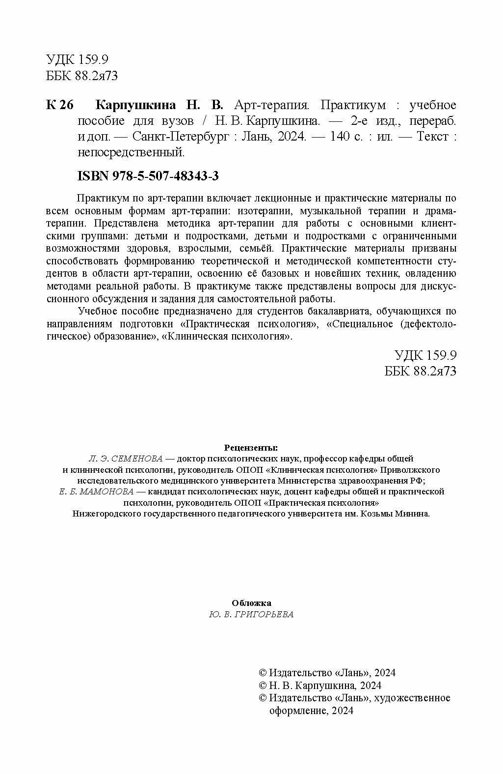Арт-терапия. Практикум. Учебное пособие для вузов (Карпушкина Наталья Викторовна); Лань, 2024