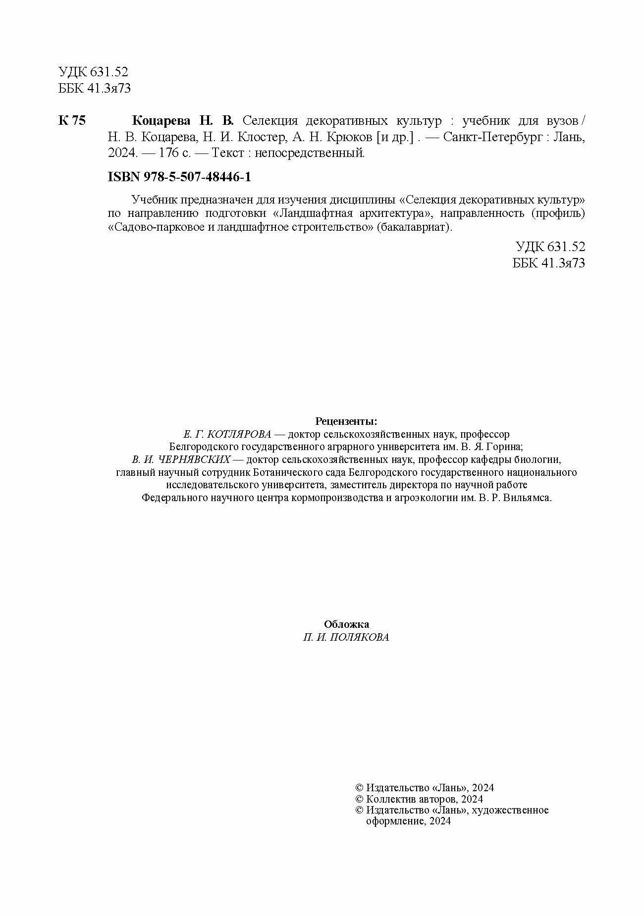Селекция декоративных культур. Учебник для вузов (Коцарева Надежда Викторовна, Крюков Александр Николаевич, Клостер Наталья Ивановна); Лань, 2024