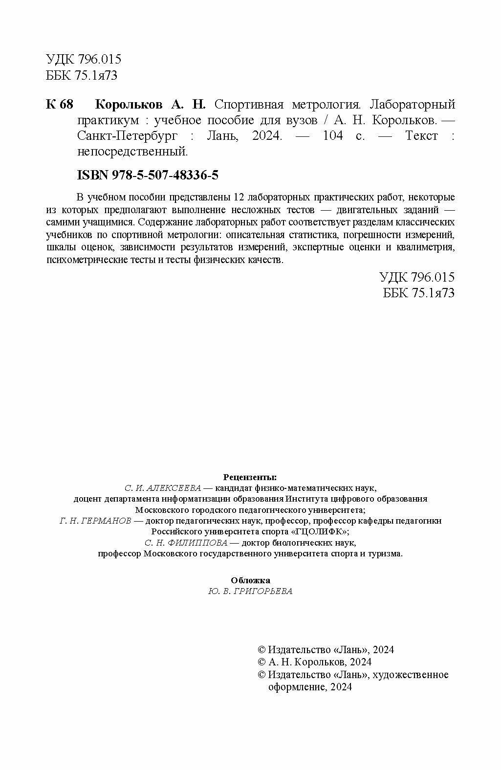 Спортивная метрология. Лабораторный практикум. Учебное пособие для вузов (А. Н. Корольков); Издательство ЛАНЬ, 2024