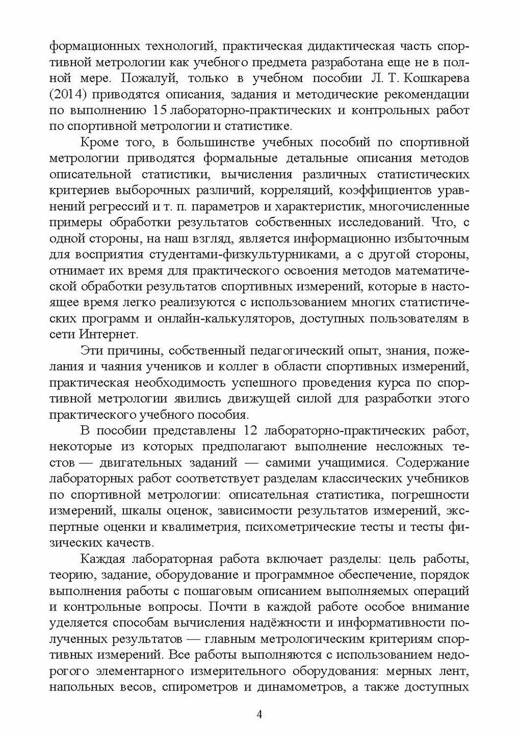 В учебном пособии представлены 12 лабораторных практических работ, некоторые из которых предполагают выполнение несложных тестов - двигательных заданий - самими учащимися. Содержание лабораторных работ соответствует разделам классических учебников по спортивной метрологии: описательная статистика, погрешности измерений, шкалы оценок, зависимости результатов измерений, экспертные оценки и квалиметрия, психометрические тесты и тесты физических качеств.